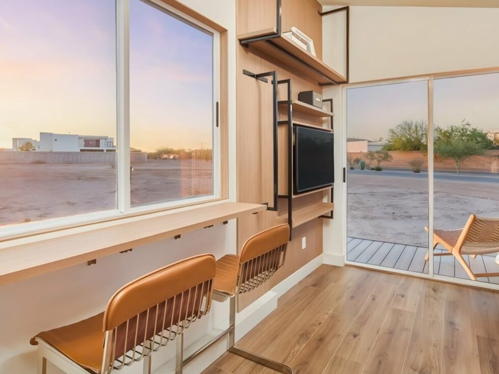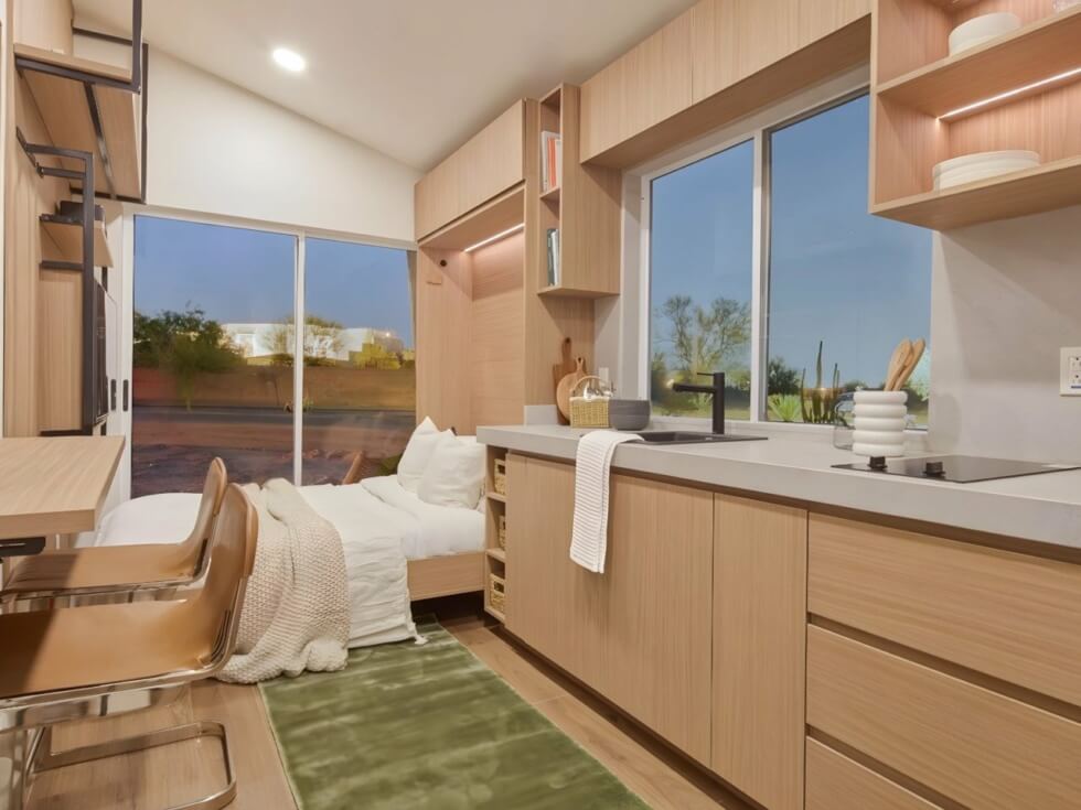 Vettel Haus also has a wooden door on one side of the house. But the question really is its accommodation. Despite it being tiny, it is well-equipped for dining, sleeping, cooking, and bathing. The living area near the glass door has a Murphy bed fronting a wall-mounted TV. Then directly beside it is the luxurious kitchen with modern appliances including from SMEG and a breakfast bar for two facing operable glass windows. The compact space even managed to include a bathroom with a tub and flashing toilet.