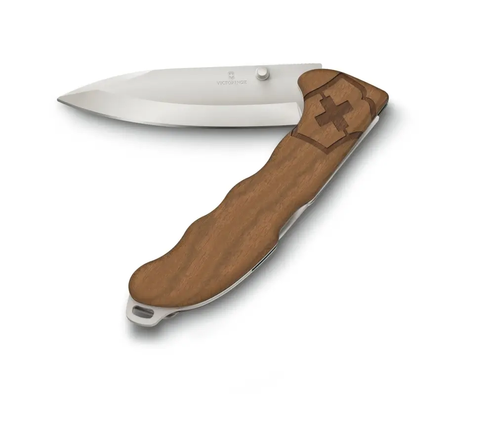 Lastly, the Evoke Wood design in the Victorinox Alox Collection exudes classic elegance with its unique Walnut Wood Alox scales. This four-function pocket knife features a lockable, one-hand blade and weighs approximately 5.3 ounces, and measures 5.4 inches long.