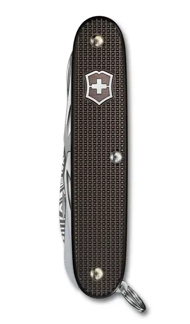 The marbled pattern is not just for aesthetic purposes. Using multiple layers of Damasteel also ensures the blade’s durability, clocking in at 60 HRC on the Rockwell hardness scale.  Moreover, Victorinox cloaked the handle in dark brown Alox scales in anodized finish, instead of its usual signature red Cellidor scales.