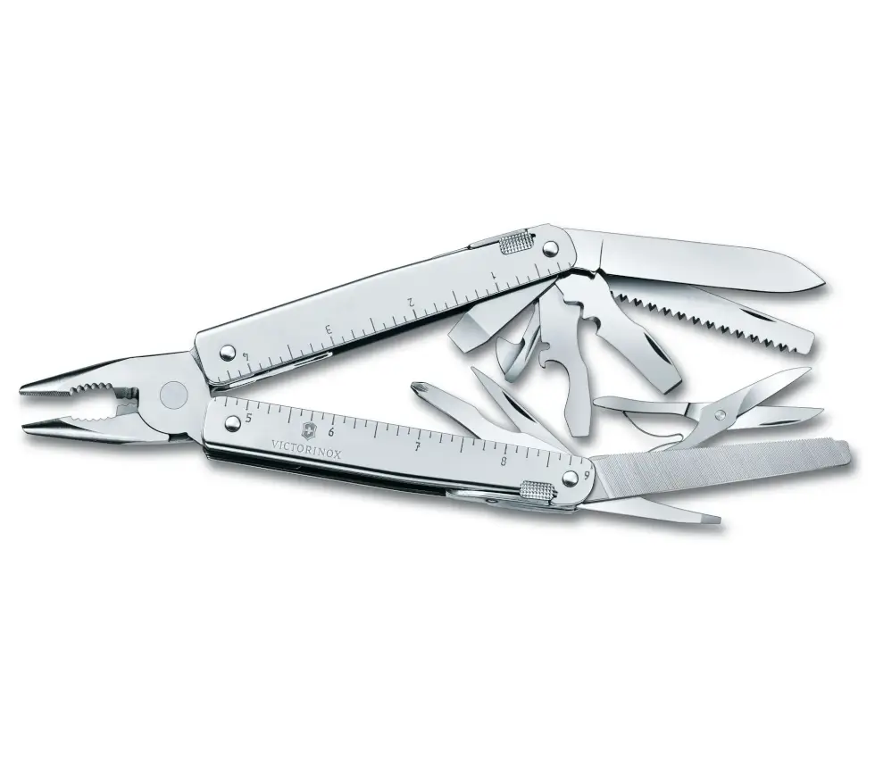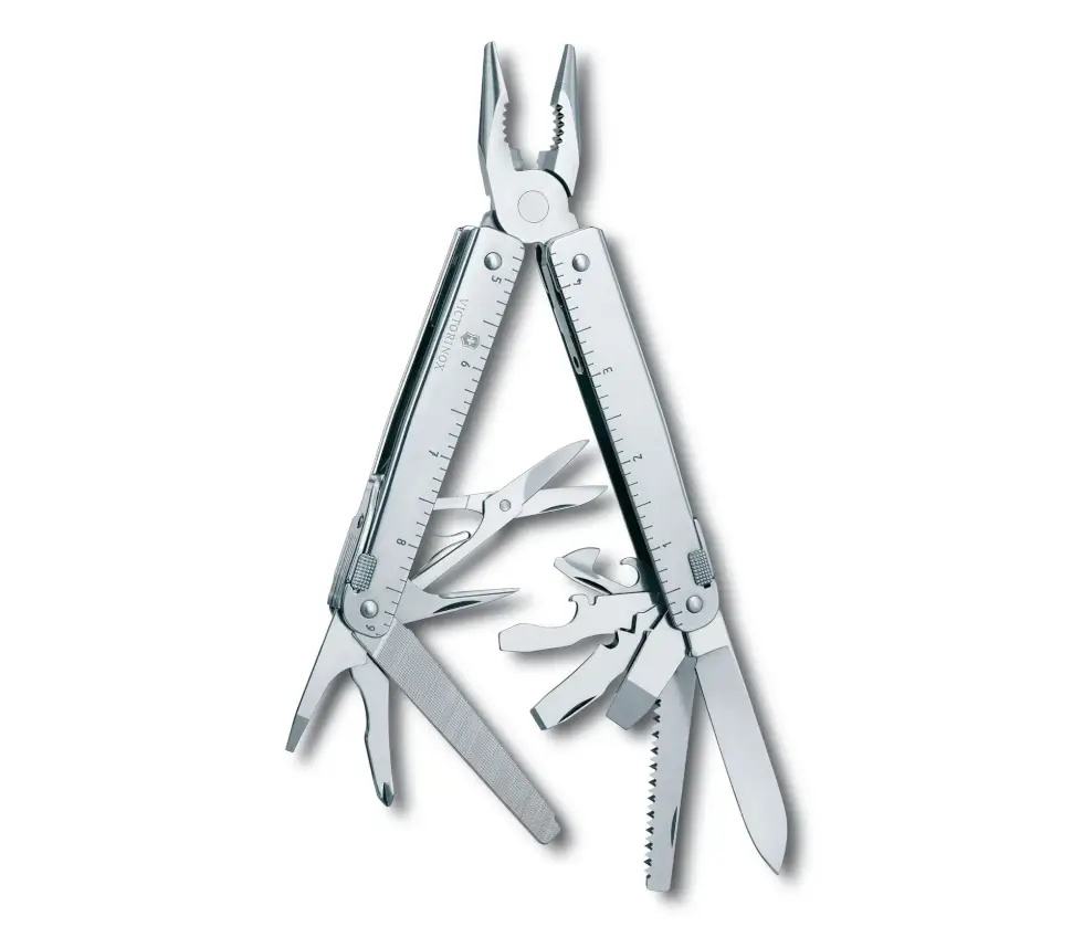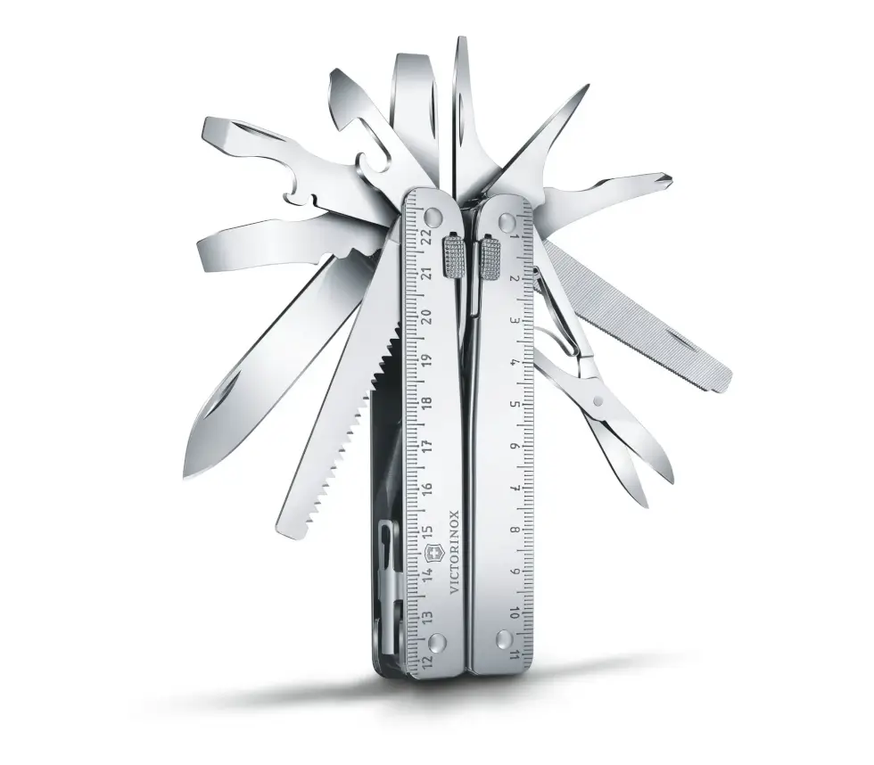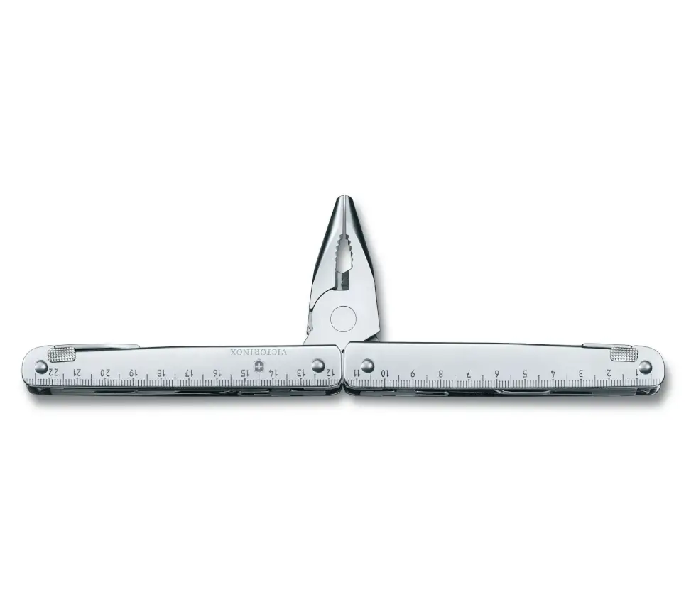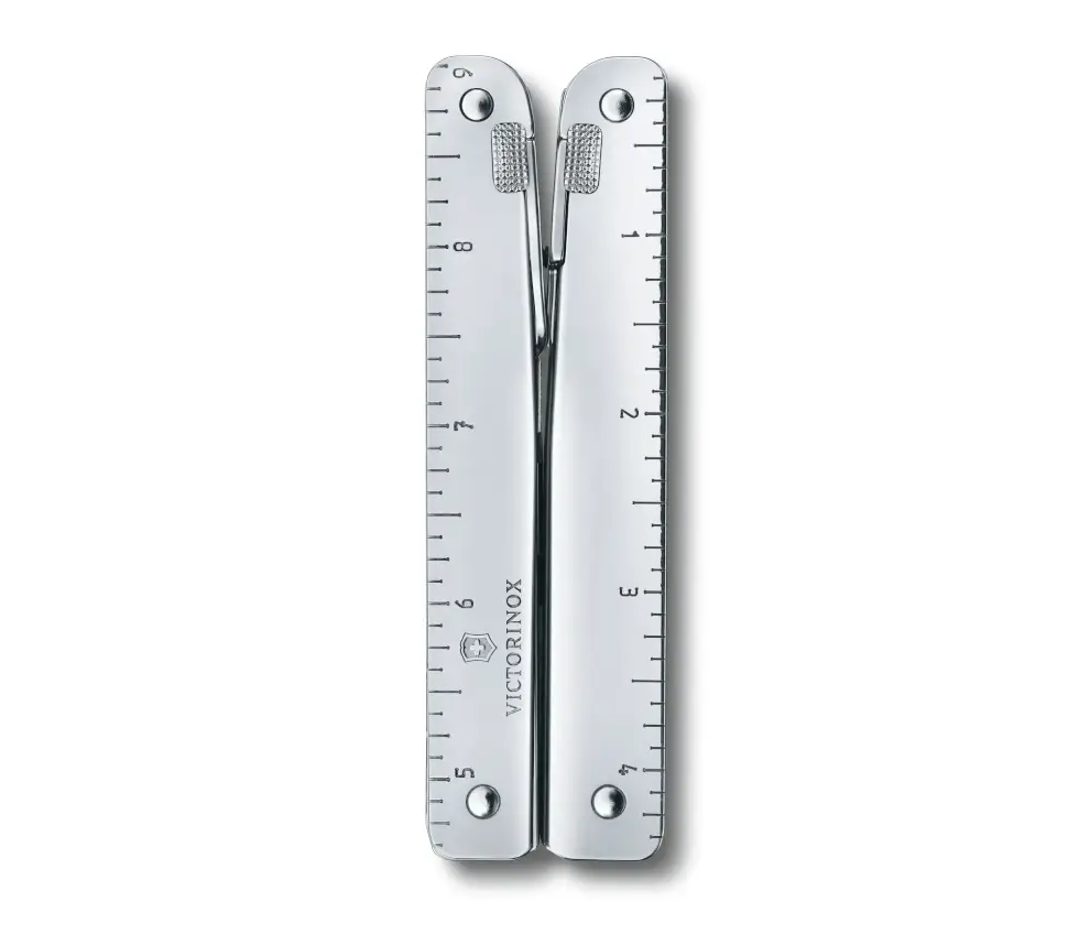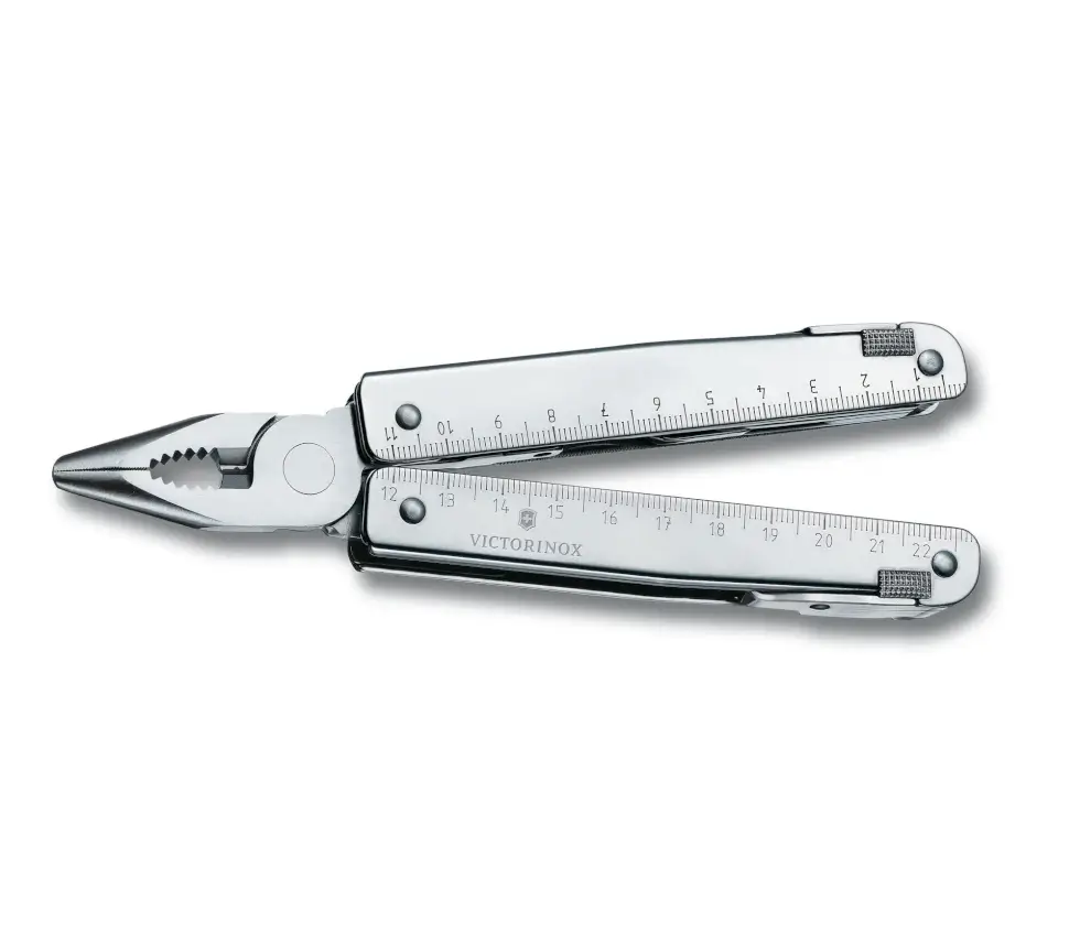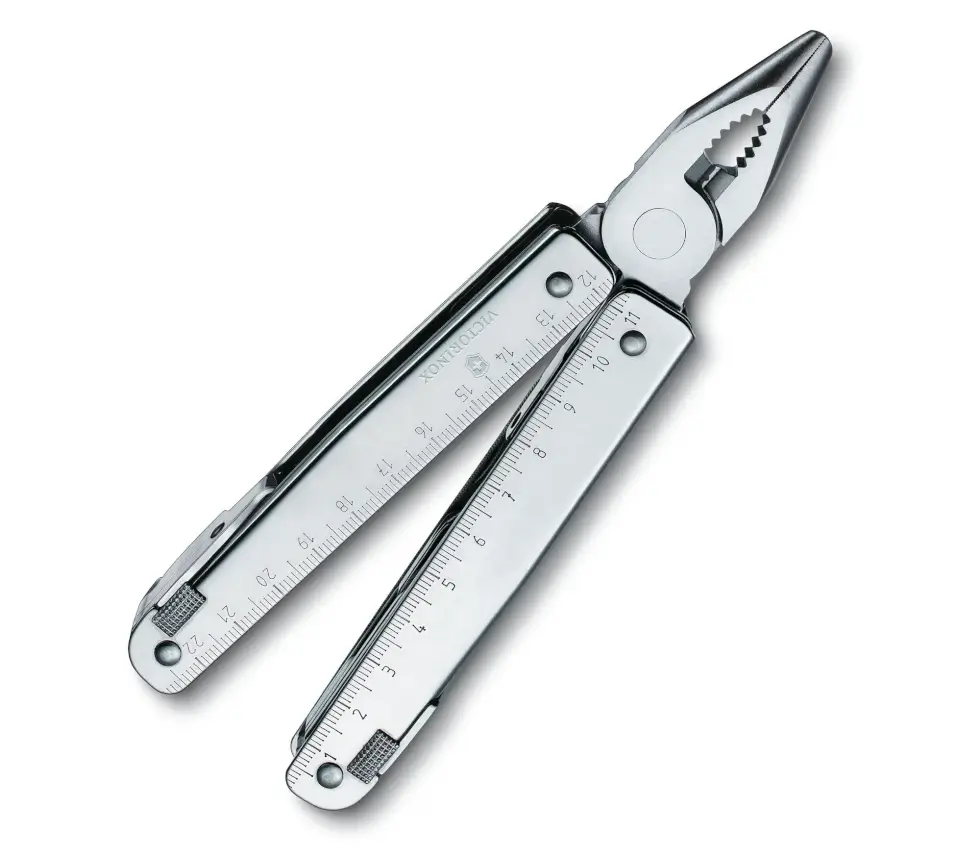 Moreover, the Victorinox Swiss Tool X packs screwdrivers in different sizes ( 2mm, 3mm, 5mm, 7.5mm) and a Phillips screwdriver 1/2. Other handy tools include a ruler, needle-nose pliers, a hard wire cutter and another cutter suited for thin and soft wires up to 40HRc, and a coupling for the corkscrew. It also has a metal and wood saw perfect for camping, a 7mm chisel and scraper, a metal file, a reamer/punch, a wire bender and wire crimper, a sturdy crate opener, and a wire stripper and wire scraper. All these tools