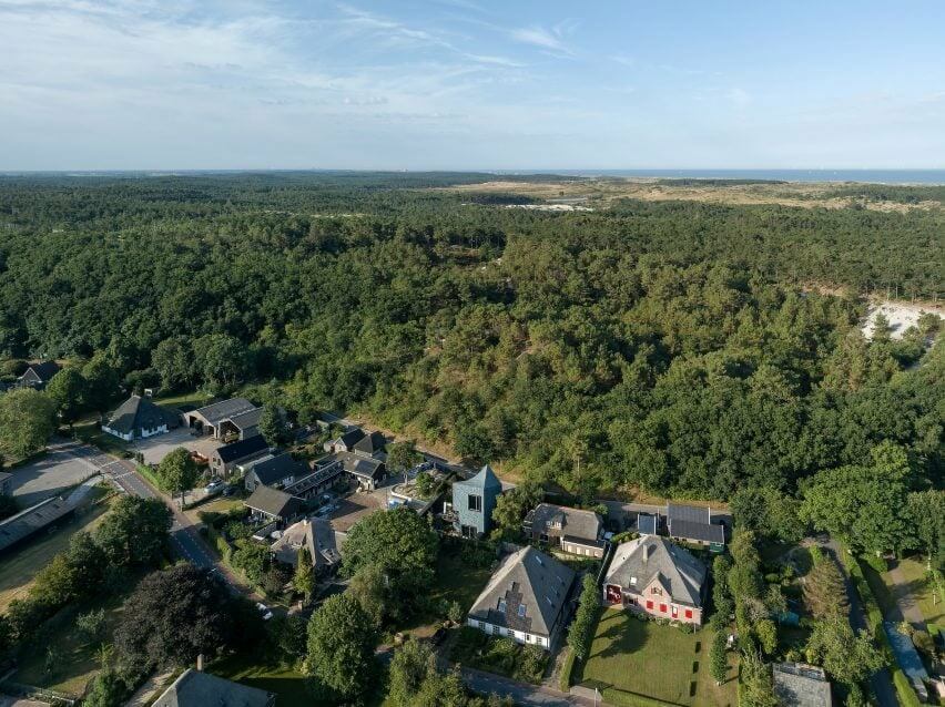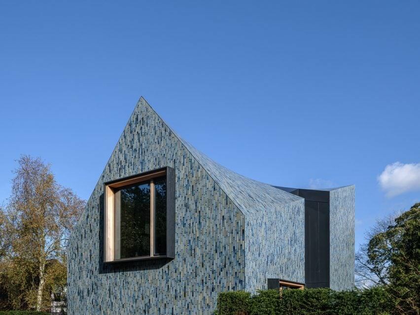 Delft-based studio Mecanoo designed the 308-square-meter Villa BW on a naturally sloping landscape. It sits in the Dutch village of Schoorl and stands out among a cluster of traditional dwellings with its double-curved roof and striking exterior clad in custom ceramic tiles.