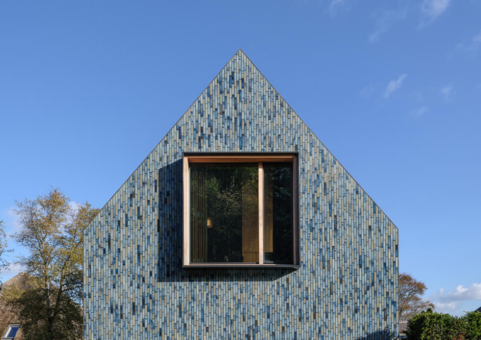 The bespoke glaze tiles come in shades of the environment to “absorb” the villa in the changing terrain. The tiles are in green, blue, and grey tones. They are vibrant and glossy and have an iridescent effect that seems to shift with the changing sunlight. Moreover, the twisting roof, the result of two overlapping shapes, also attracts attention. It has a gable roof on the dune side and a horizontal roofline on the polder side.
