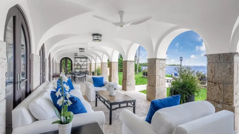 The villa is flocked with towering oak trees, palms, lush landscaping, large bodies of water, and sits on 300 feet of waterfront. It even has a private boat slip and 180-degree views of Sailboat Bay. Its natural surrounding scenery evokes a sense of peace and calmness. This is how Elena Bluntzer of One Sotheby’s International Realty described the estate. Its “lifestyle is that of pure serenity in a natural, native Coconut Grove hammock.”