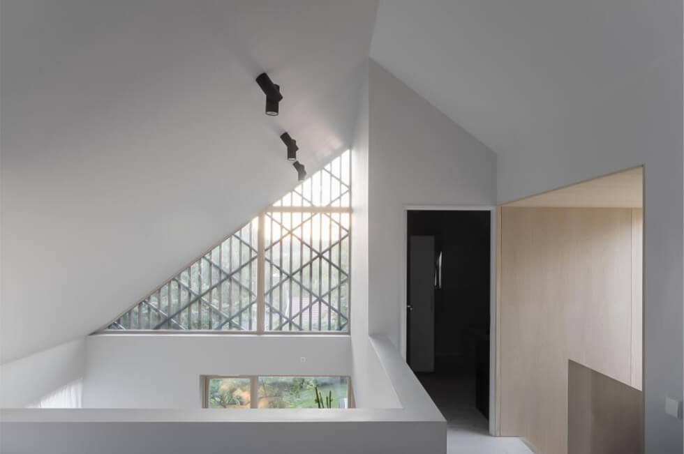 This allows the interior to receive an ample amount of sunlight throughout the day. Tones of white, gray, and woodgrain are distributed evenly across the interior volumes. This creates an inviting atmosphere for the residents of the Villa Timmerman and guests alike.