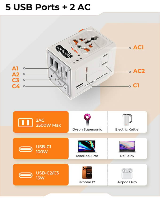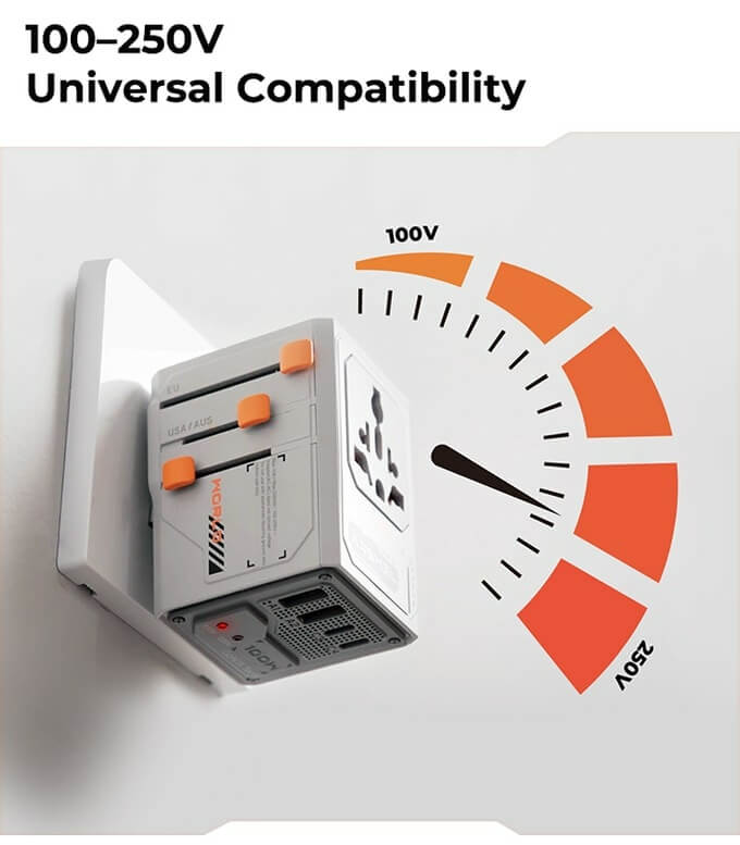 Yet, the VisaGo can fast charge an amazing seven devices simultaneously. It has two AC outlets, three USB-C ports, and two USB-A ports. This way, you can charge your phone, camera, or laptop at the same time. Its a universal charger with a wide voltage range of 100–250V and compatible with several countries in Asia, Africa, Europe, America, and Oceania.