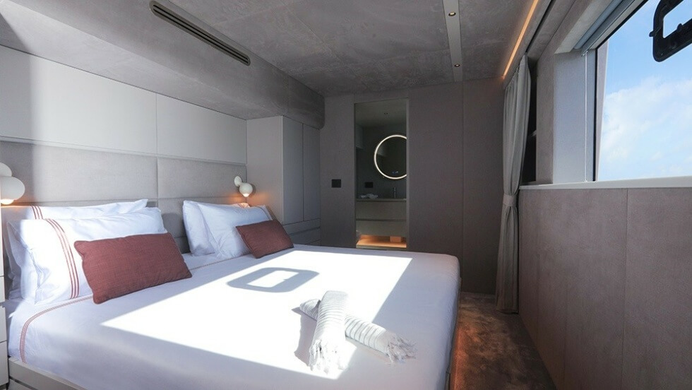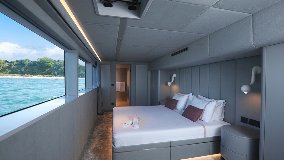The aluminum 80-footer owes its striking cosmetic characteristic to London-based Thurstan Design. Even the interiors are chromatically curated to match, albeit in varying hues. Supplying the furniture are the likes of Farrow & Ball, Crate & Barrel, Rove Concepts, Moro, Paola Lenti, and Kravet. Meanwhile, the rest of the pieces are in-house works from VisionF.