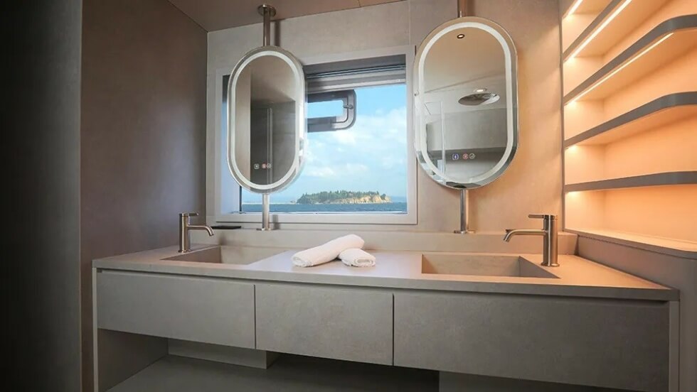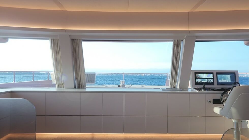 It can accommodate up to eight guests across four lavish suites. Moreover, there are plenty of spaces for entertainment and socializing aboard this 80 catamaran. Propulsion is supplied by two Volvo Penta IPS 1050 engines to push it up to speeds of 18 knots.