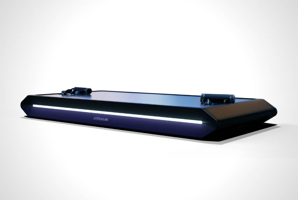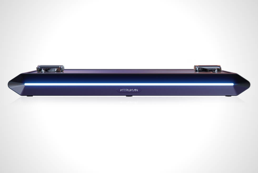 To make it easier to transport, there are a pair of wheels on one end and a handle on the other. An LED light strip gives you a visual cue on the current operation status. Just below that is a stylized text that reads “Vitruvian” which is an awesome minimalist approach to branding.