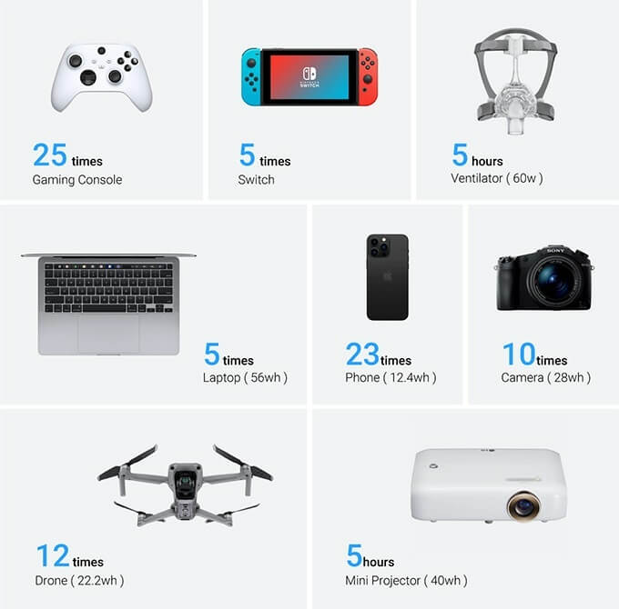 This power station can charge seven devices simultaneously so you can forget about bringing separate power banks on the go. It can charge a Nintendo Switch five times, a 12.4wh phone 23 times, a 56wh laptop five times, and a 40wh mini projector for five hours. This device can even power a ventilator at 60W for five hours.
