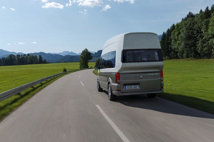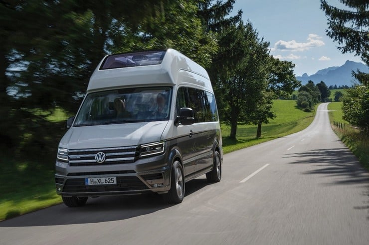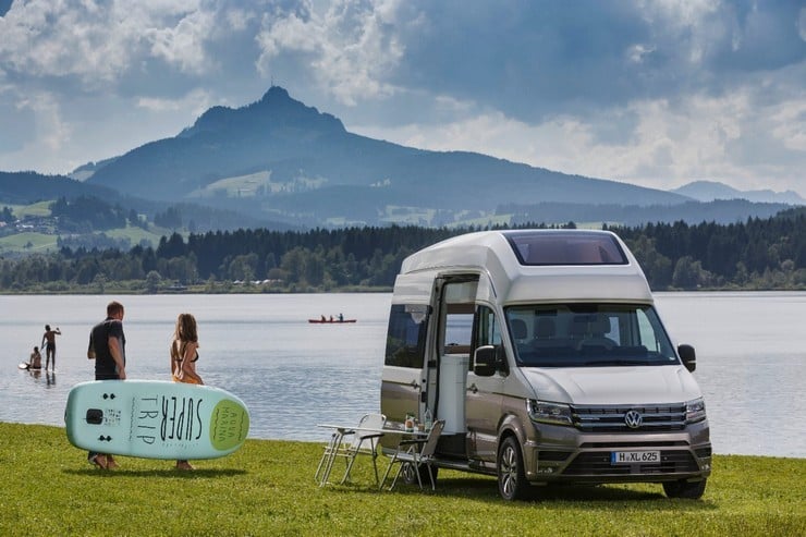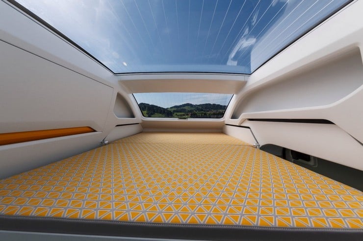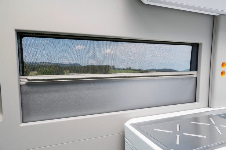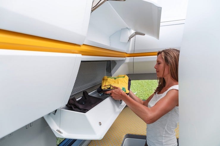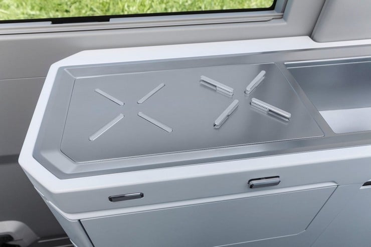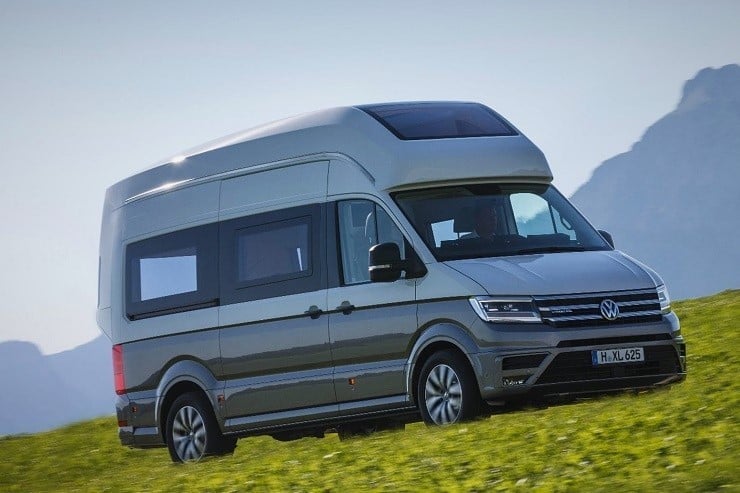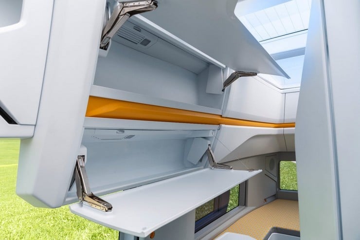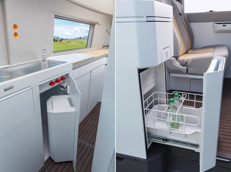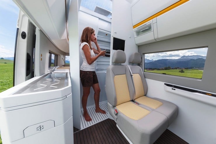 The XXL has a 143″ (3.64m) Crafter wheelbase and a very high 7.2′ (2.2m) fixed panoramic roof. Underfloor heating provides year-round comfort and six USB ports and nine 220V outlets provide power for appliances and devices. The full-featured kitchen also has new innovations including a dual 50L refrigerator under the stove and a second 50L refrigerator/freezer over the kitchen block. The table can be removed & fastened to the outside of the van for open-air enjoyment.