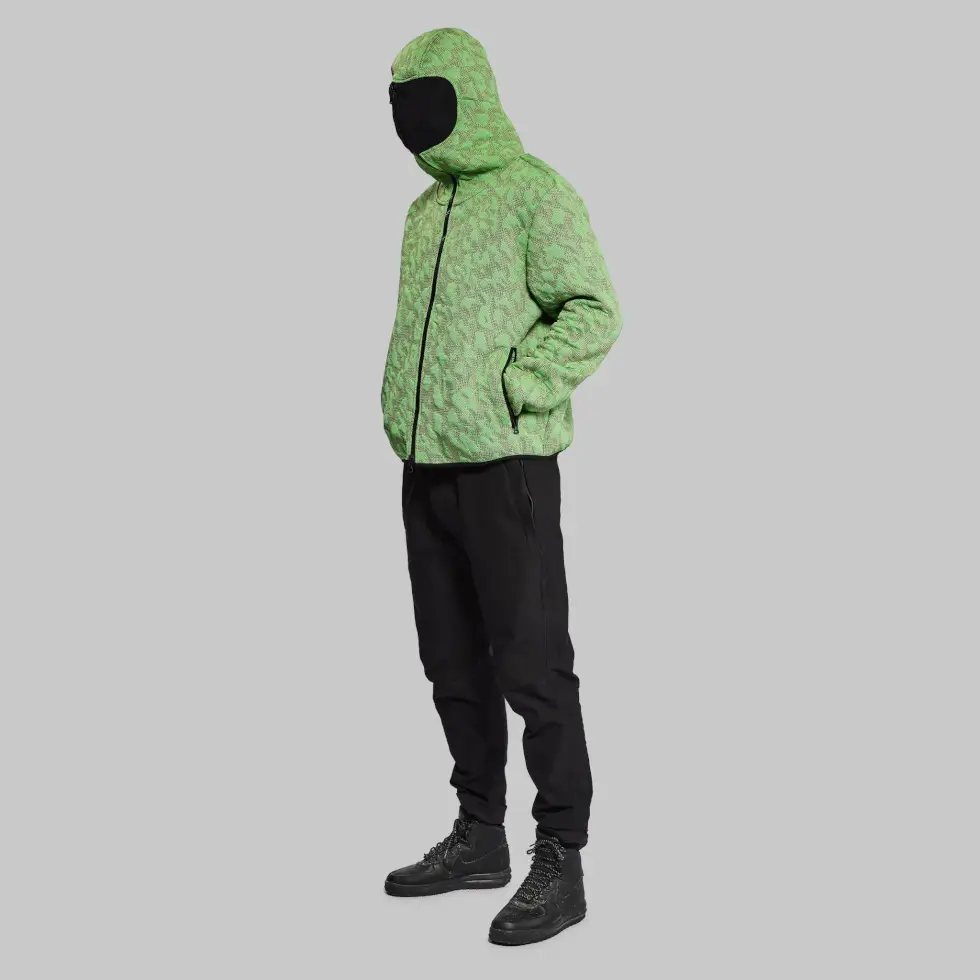 Unlike other jackets that zips just up at the neck, this one goes up to the top of the head for complete isolation and privacy, making it the ideal wear when you want to get a good shut-eye during long flights or commutes. The mesh visor lets you see out but blocks others from seeing your face and the hood is lined for softness.