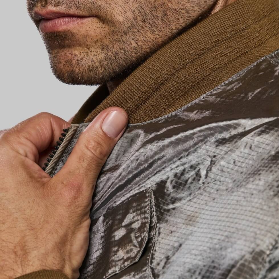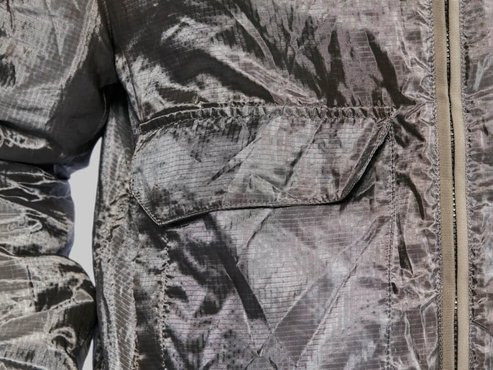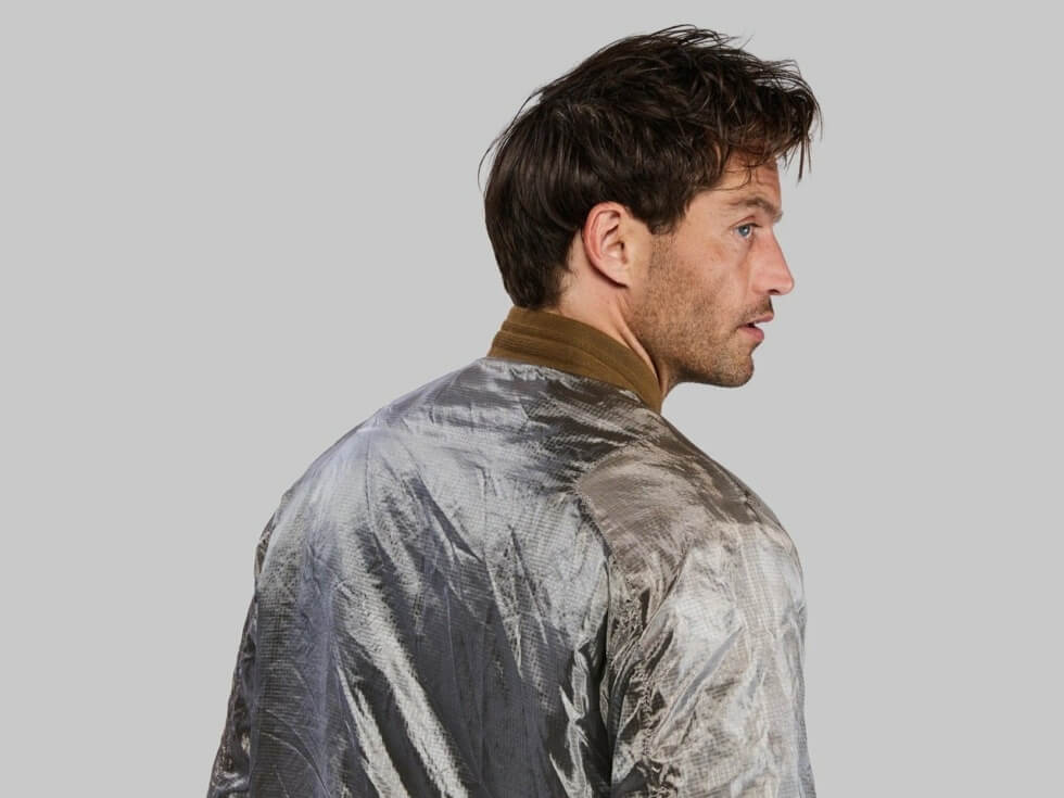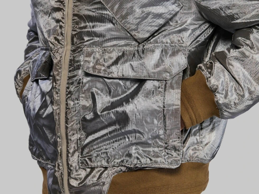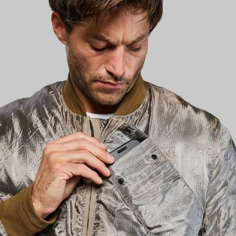 Vollebak’s Electromagnetic Shielding Bomber uses the same aerospace-grade Shieldex fabric also found on its Shielding Suit. The fabric protects electronics from cyberattacks, blocks thermal detection of satellites, and supports sensors in wearable health monitors. It is built into its ripstop nylon shell and makes up about 20 percent of the jacket’s surface, making it both mechanically strong and cutting edge.