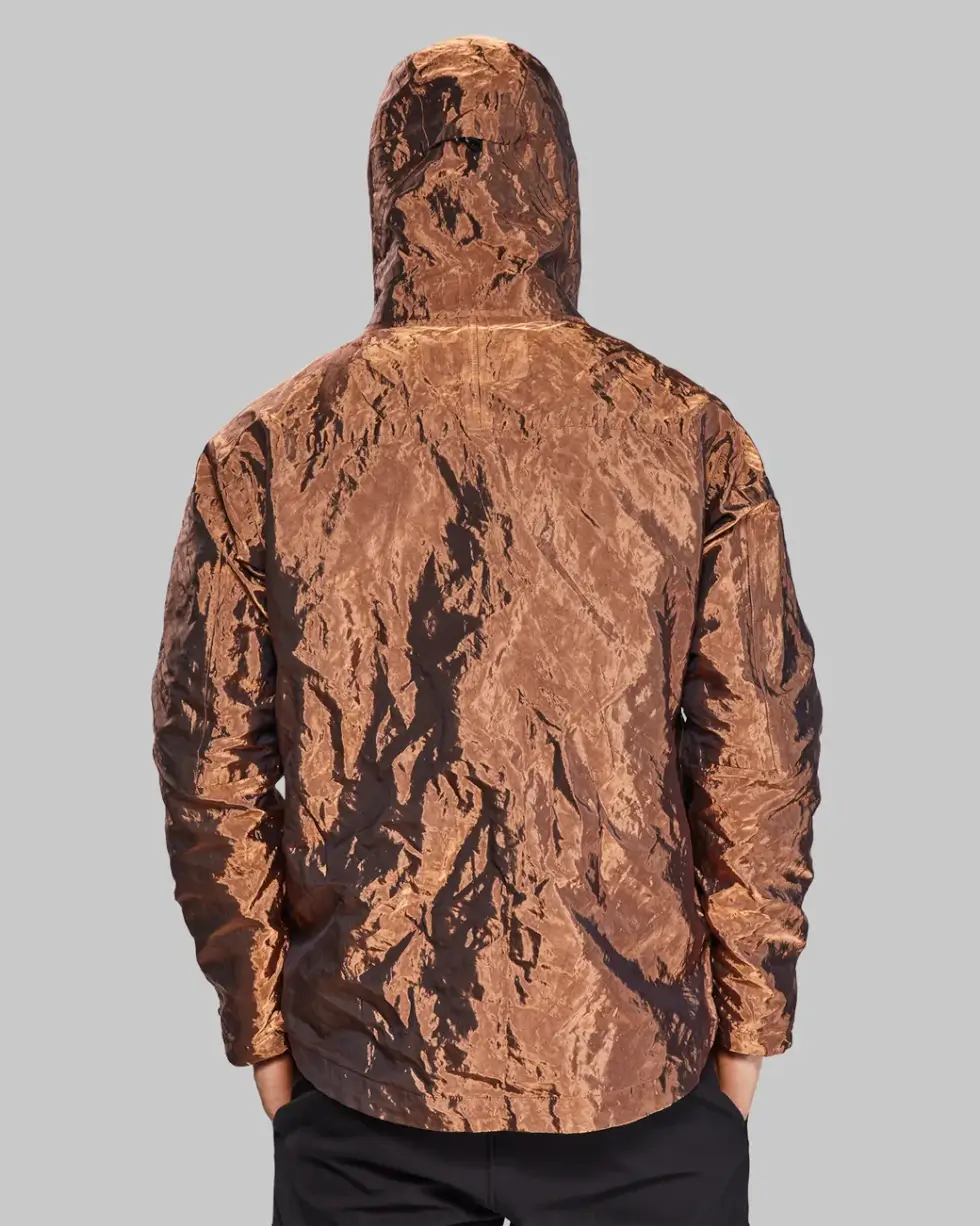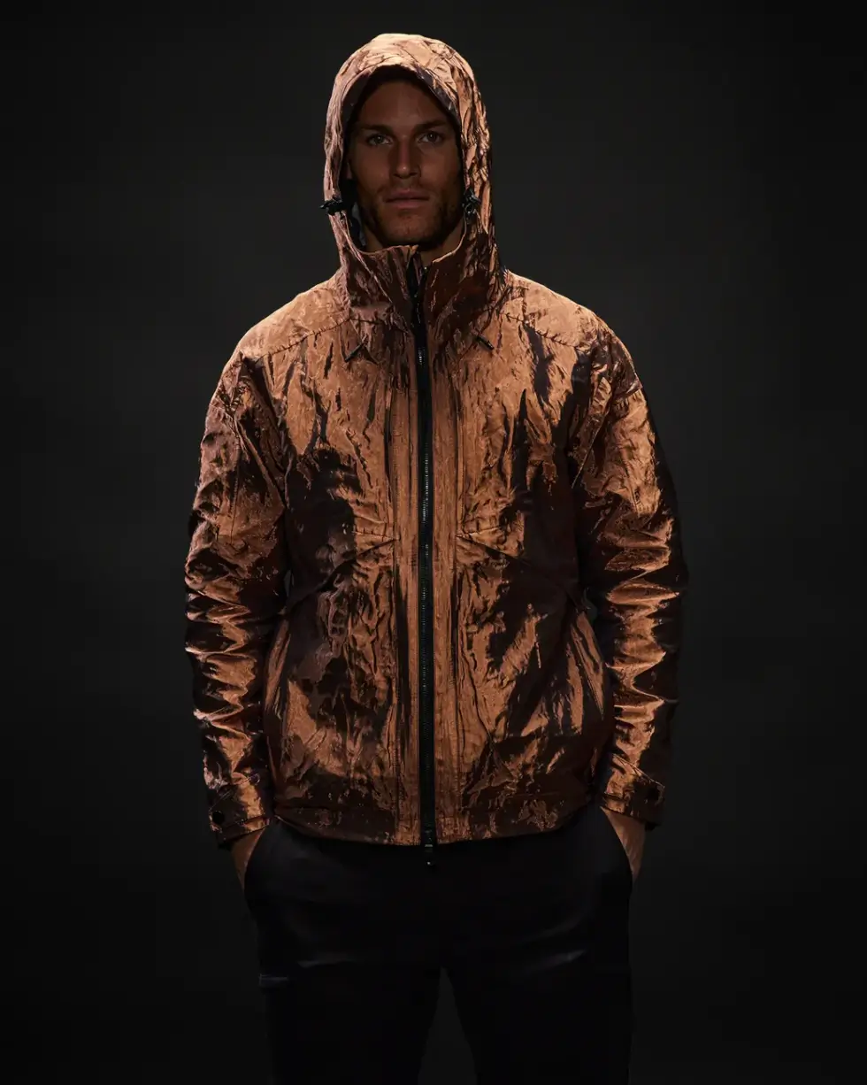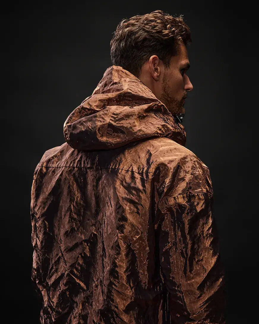 Then the strands are heated to make them malleable and applied with very thin coats of lacquer to protect the copper from corrosion. They then go through a 6-day curing process which involves weaving the yarn on rapier weaving looms before they are scoured, heat-set, and dried. The Vollebak Full Metal Jacket then appears in a stylishly unique and fashion forward silhouette with its metallic and wrinkly appearance.