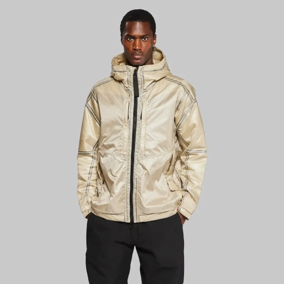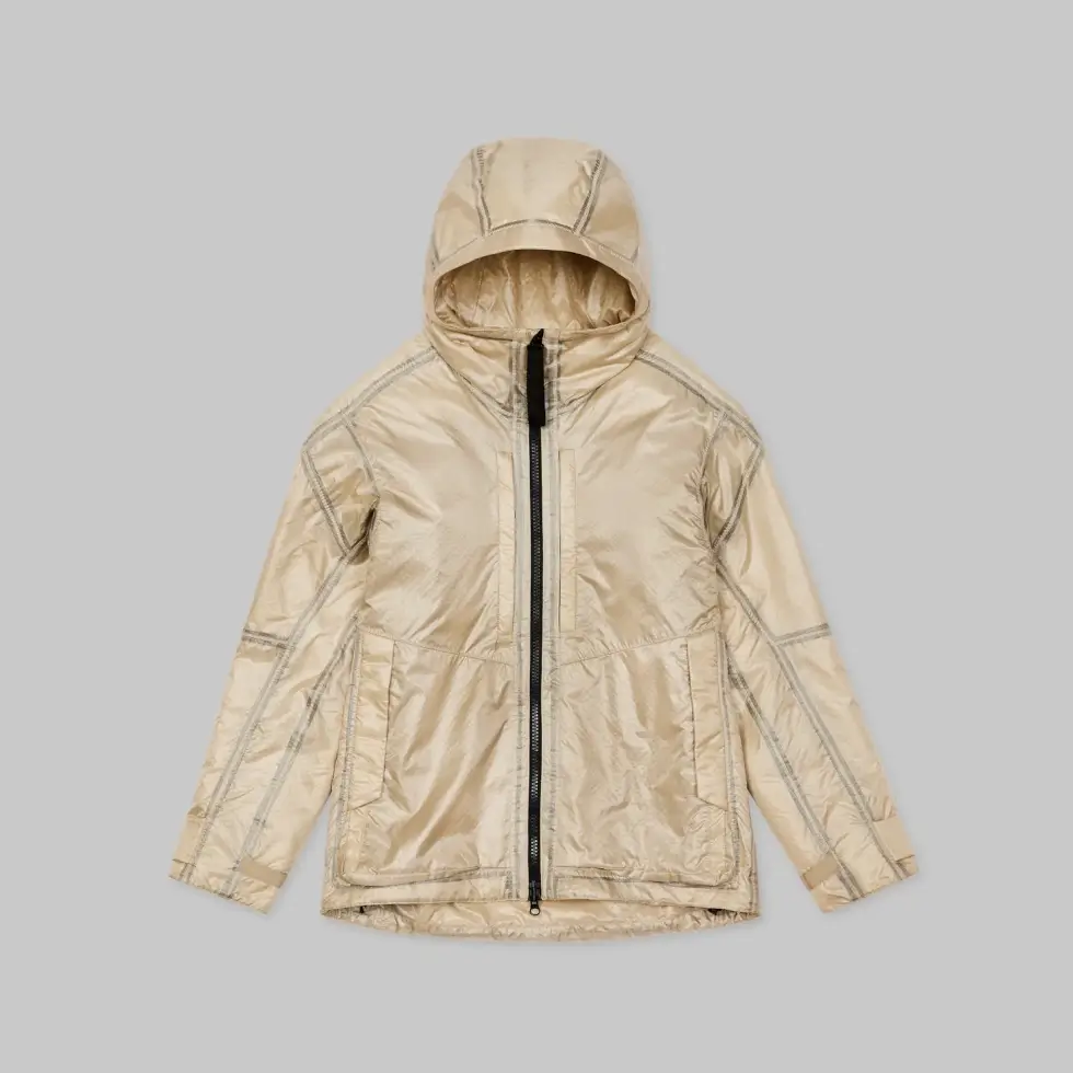 This is performance wear that can survive a downpour and still keep you warm and dry. Even when soaked or compressed in water, it remains insulating. Even its peaked hood has aerogel lining for added insulation. Then cord adjusters at the hood and hem and cuffs with metal snaps seal the warmth in from head to waist.