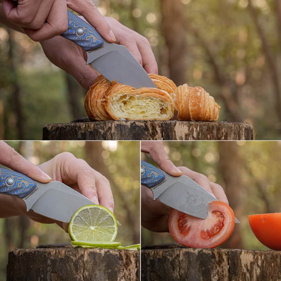 While its blade measures only 3.57″ long, it is still thick enough at 0.138″ to offer reliable and solid cutting or chopping performance. It can withstand everyday heavy-duty use thanks to its robust construction made from durable and stonewashed 14C28N steel. This material offers great edge retention, corrosion resistance, and is easy to sharpen.