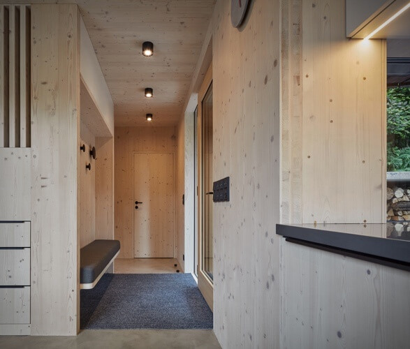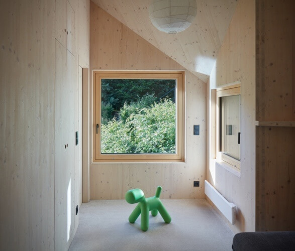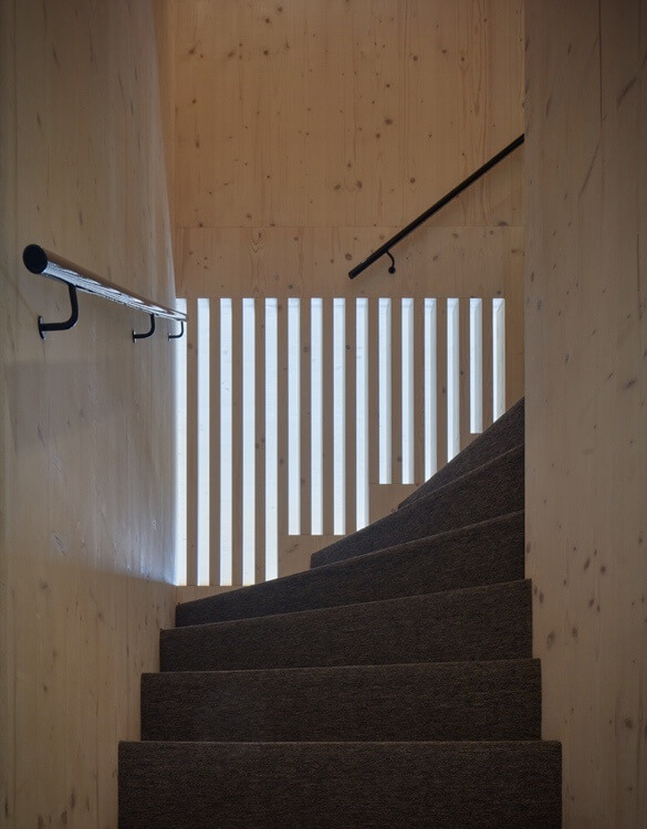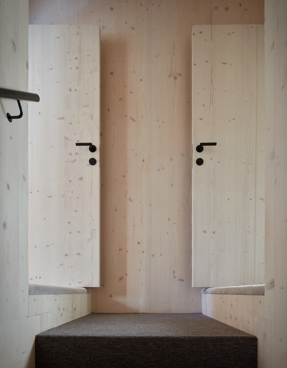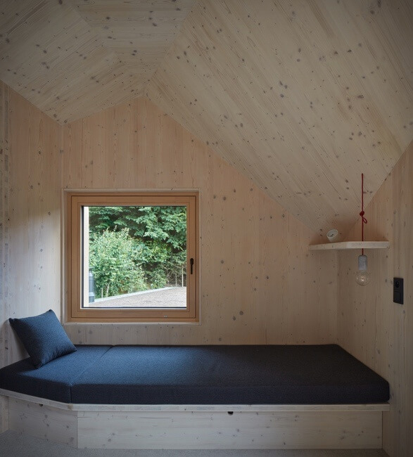 The cabin boasts an impressively large interior for both sleeping and living spaces with storage spaces built within walls. It uses spruce wood that provides a cozy and natural ambiance. Meanwhile, glazed windows bring the beauty of the surrounding topography inside.
