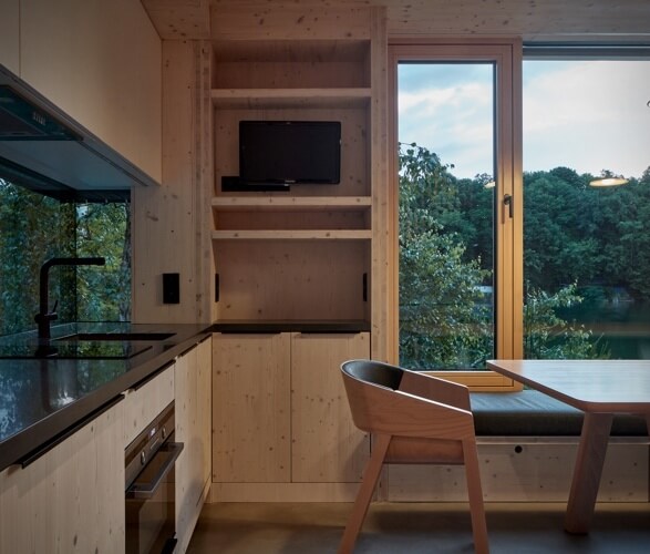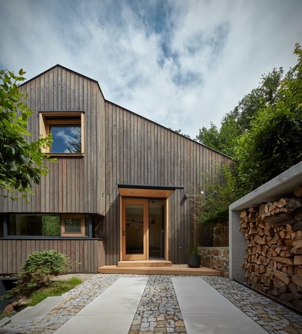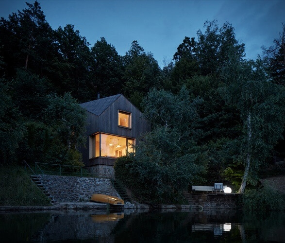 This lakeside house that sits on greenery above the Vranov Dam in the Czech Republic is full of surprises. It may not look like much on the outside with its small frame disguised by sunburned larch planks. It looks simple but inside packs extreme functionality fit for a family.