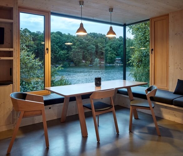 The interior design is inherently Nordic with wood and natural tones dominant from the walls, furniture, and more. Despite its modest exterior, the inside packs with modern offerings. The living and dining room comes with a built-in oven, built-in wall LED lights, pendant lights, an exhaust hood, an elegant sink, and long paneled windows overlooking the lake.