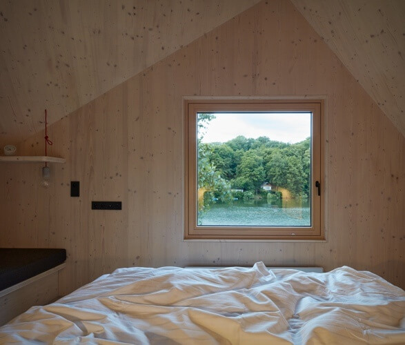 The Vranov Dam lakeside even cabin has a spacious entrance hall with a bench for changing, built-in storage drawers on the wall, a bathroom, a separate toilet, a pantry, and even a utility room. The attic occupies the bigger portion of this ship-inspired cottage where it offers the dressing room and bedroom. The practicality in the interior design stands out as every centimeter is not wasted.