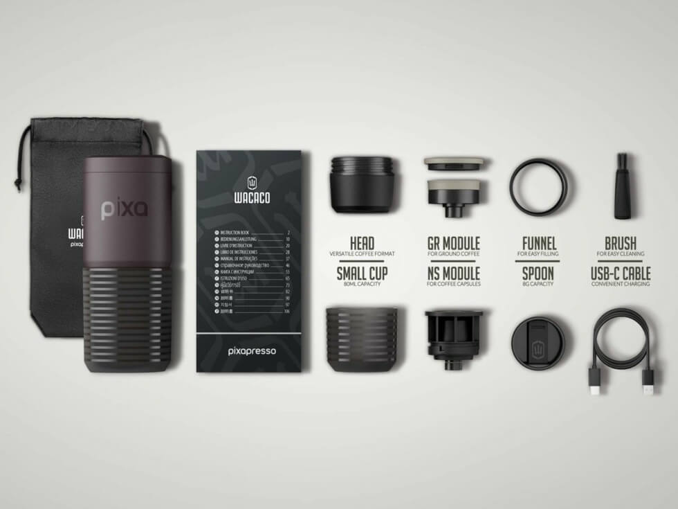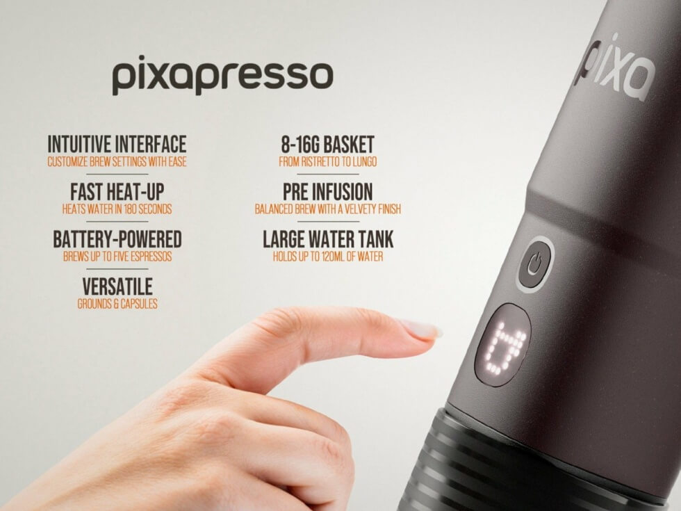 Wacaco has embraced the electric revolution with the release of its first compact, electric portable espresso maker, called the Pixapresso. Powered by a rechargeable battery, it combines the portability of its previous manual offerings with the ease of use and efficiency that only automation brings.