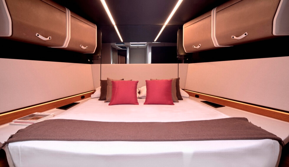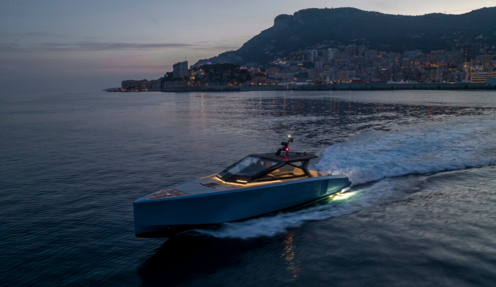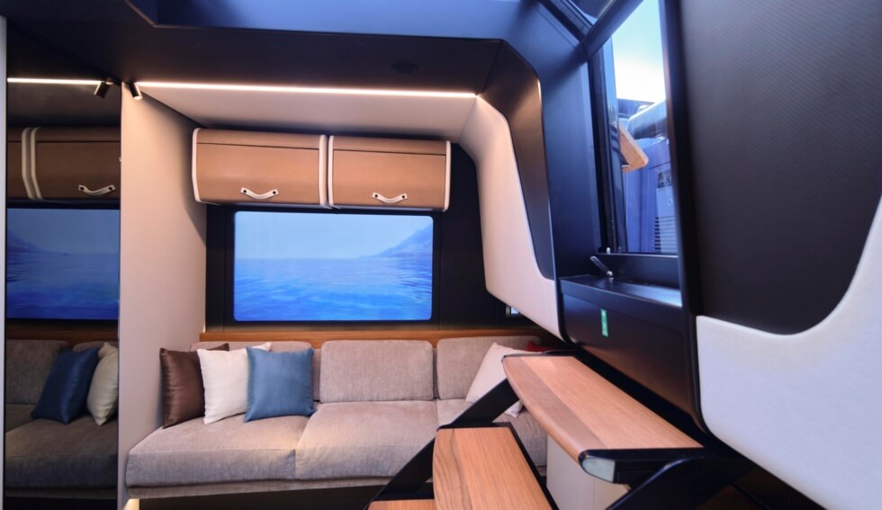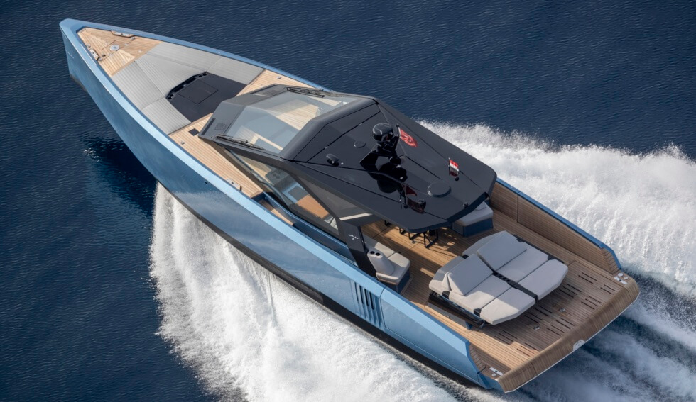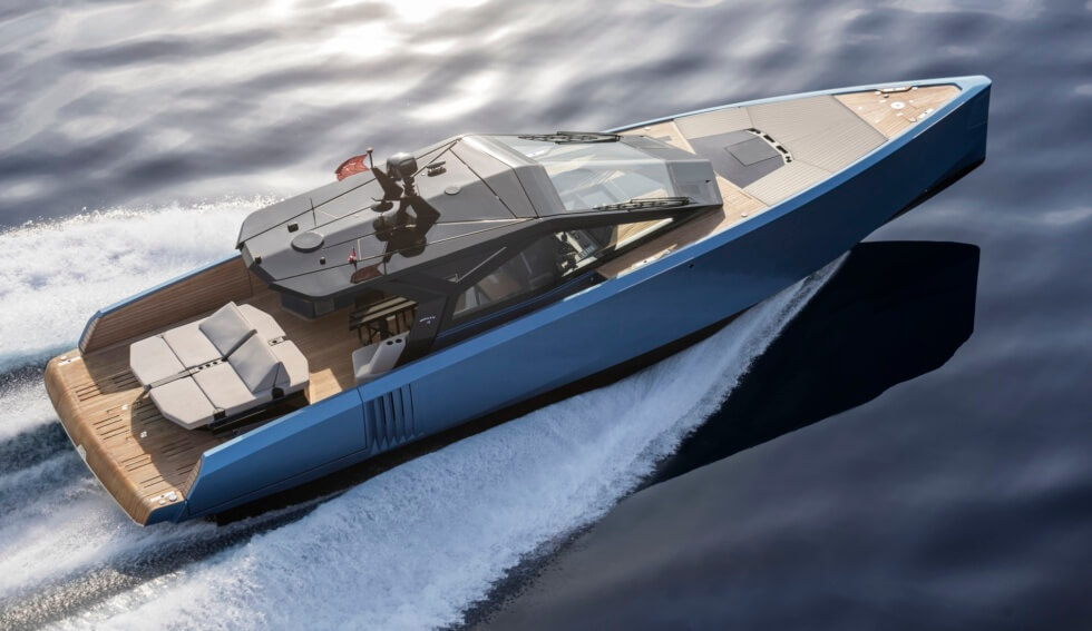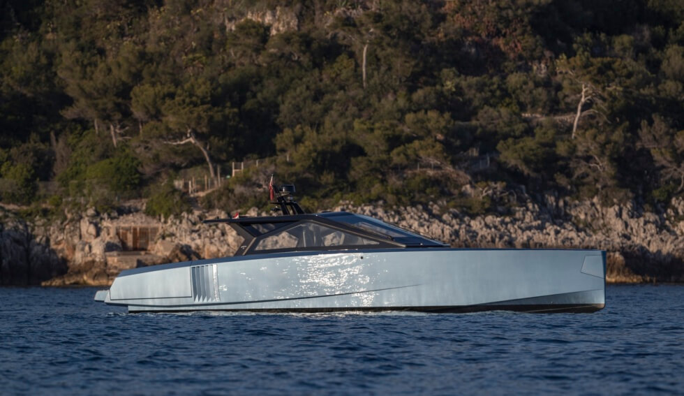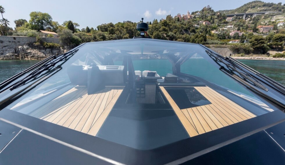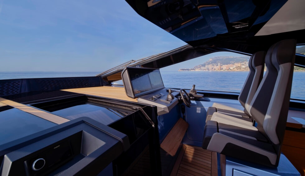 This 58-footer is one of the many silhouettes that made their debut at this year’s Cannes Yachting Festival. With a 16.5-foot beam, owners have plenty of room to move about and customize. Propulsion comes from three Volvo Penta D8-IPS 700 at 550 horsepower each for a total of 1,650 horsepower as standard.