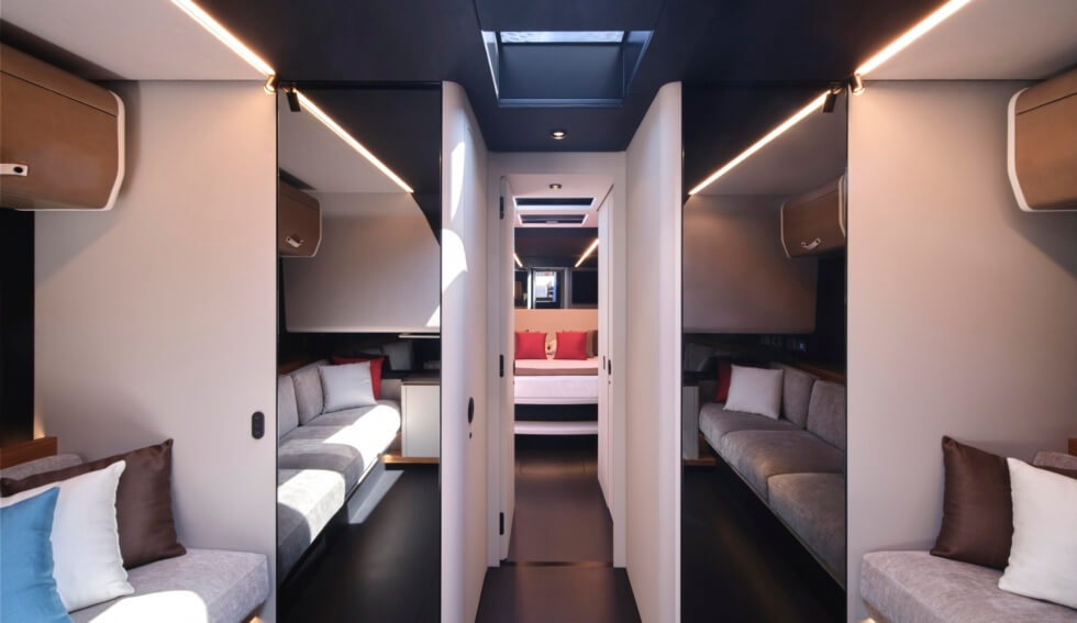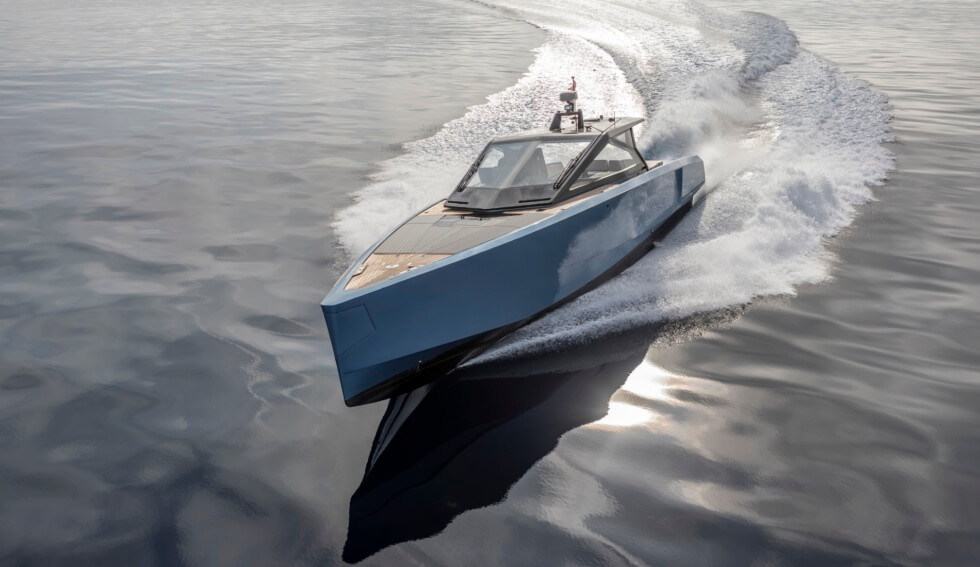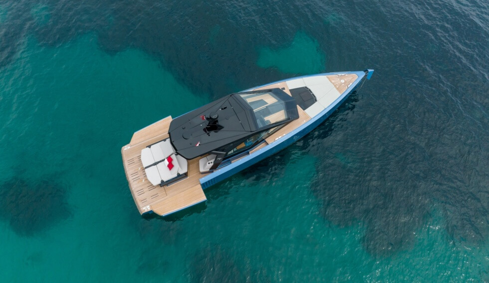 “The wallypower58 features pure lines dominated by the double chines in the hull and the air intakes,” reads the shipbuilder’s description. “The yacht’s interior is bathed in natural light from overhead, meaning there is no need for traditional openings to port or starboard.”