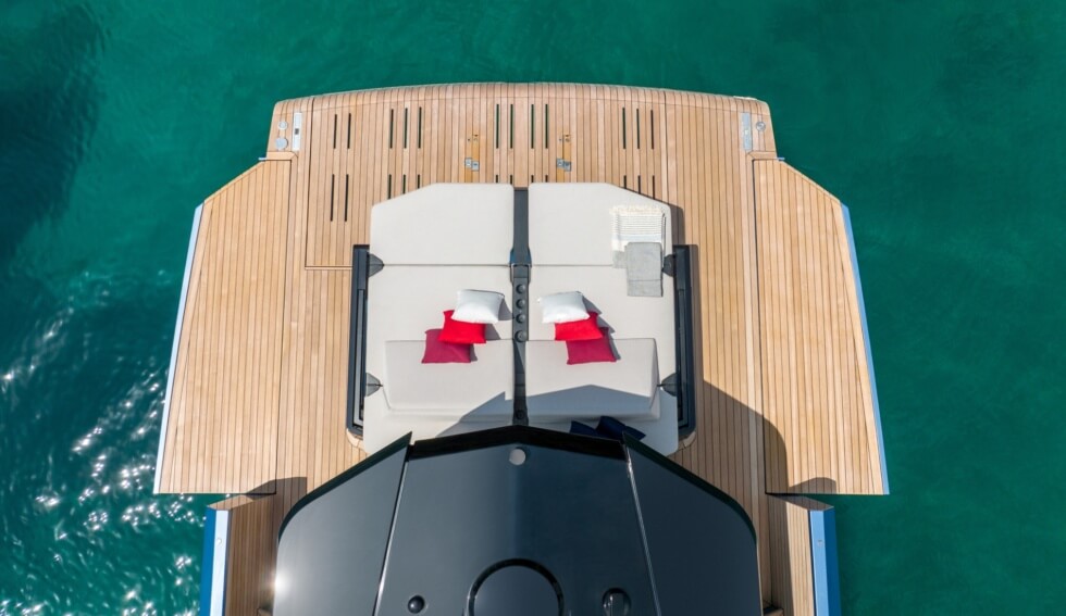 A spacious foredeck and the aft sun pads are perfect for sunbathing. Storage for toys and other equipment is beneath these seats. The folding bulwark wings toward the rear can open to provide about 269 square feet of space. Wally Yachts uses teak topside for a classy appeal.