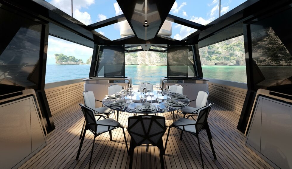 “As a crossover product, the yacht fulfils the need for a more voluminous cruiser in the sub-70ft range, combining all of the qualities of a 60-70 foot coupé boat with the benefits of the wallywhy volume,” notes Wally Yachts. The main deck features a hybrid layout. You can configure the enclosed area for al-fresco socializing or to keep away the elements.