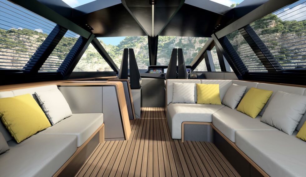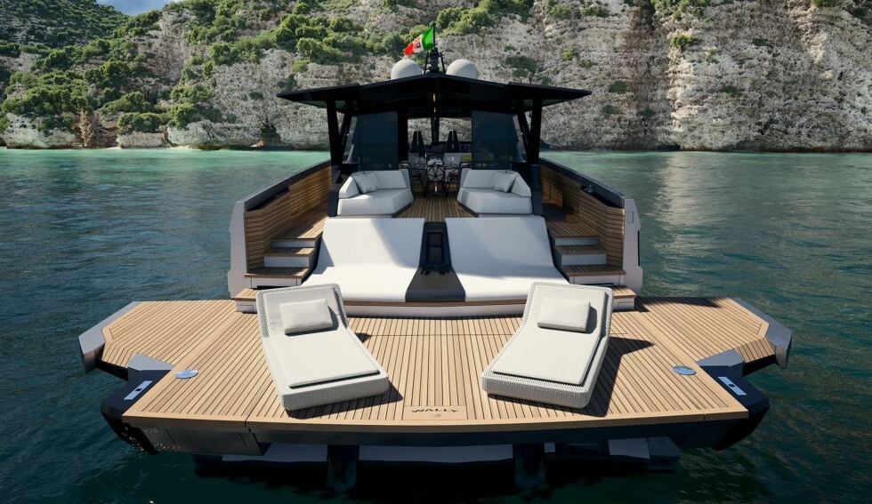 The use of modern materials plus wood creates a pleasant and cozy atmosphere for its volumes. There is plush seating within, as well as sun pads and lounge chairs for those who want to soak up some sun. Toward the aft of the wallywhy100 are folding wings which provide 142 square meters for the beach club.