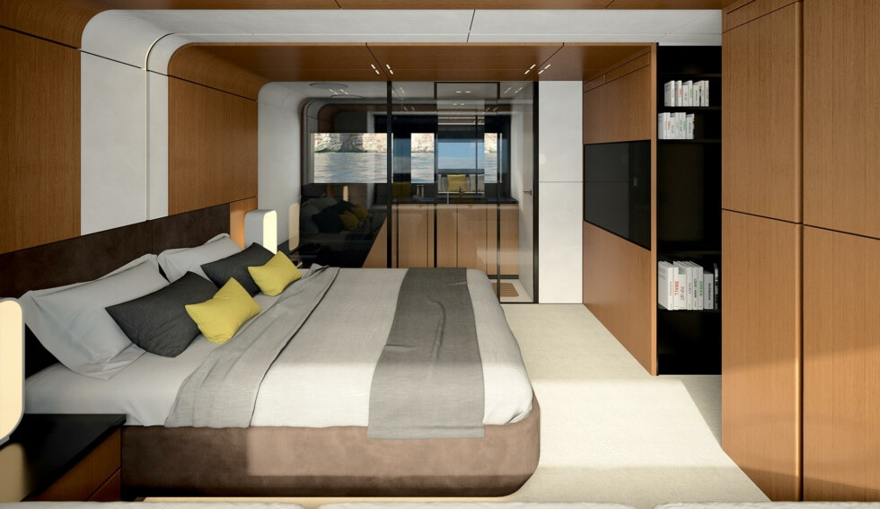 Head down to the lower deck to access a full-beam master cabin accompanied by two guest cabins. Each room provides guests with impressive views of the outside. The wallywhy100 gets its propulsion from twin D13 Volvo IPS engines for a cruising speed of up to 24 knots.