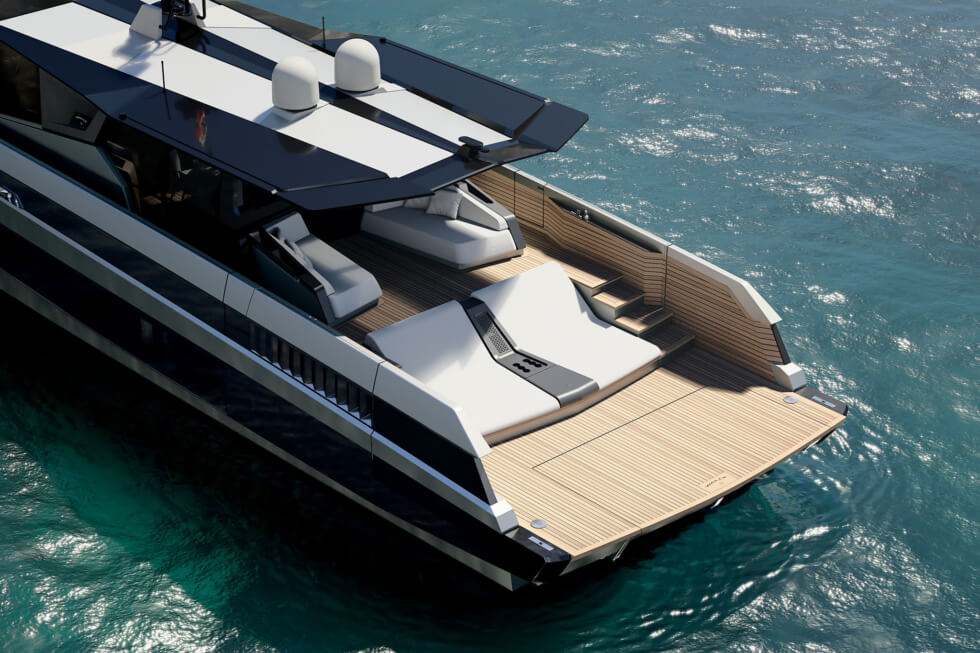 The shipyard positions the helm slightly forward which in turn delivers a larger aft section. There you’ll find fold-out terraces, a hydraulic platform for tenders and water toys, and a hydraulic ladder to access the waters.