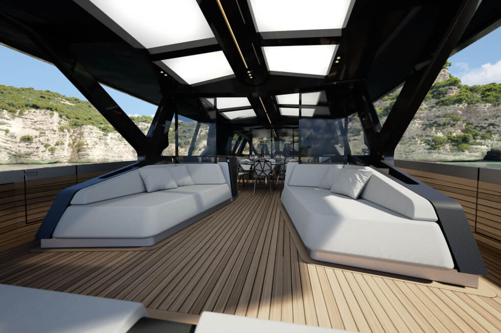 With a sleek and sporty profile matching its larger siblings, owners can look forward to superior seaworthiness and thrilling performance. Starting with the main deck, a covered cockpit also comes with a dining area and saloon.