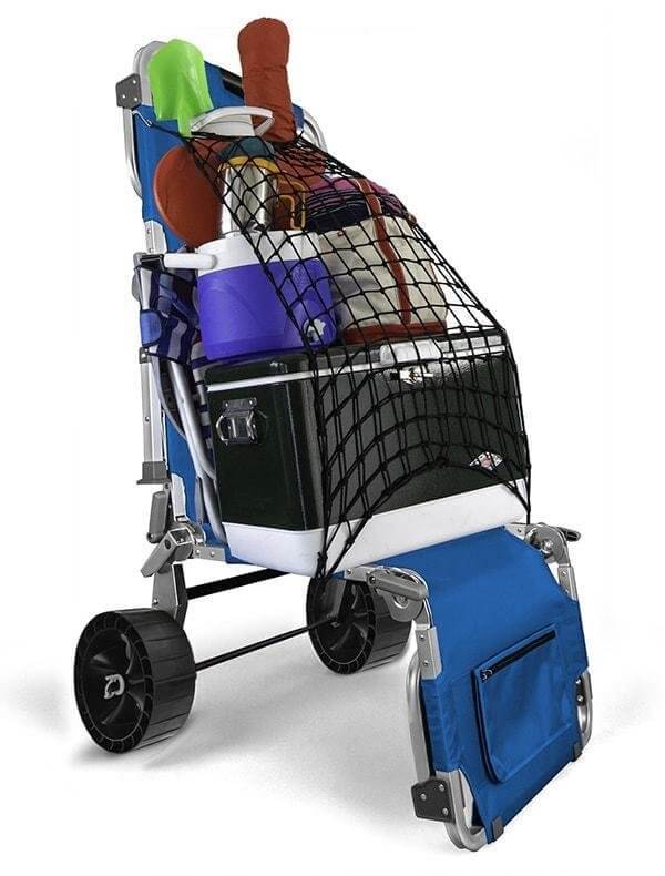 Plus, the patented Sandtrakz, non-air-filled, and all-terrain wheels on the Wanderr Chair make transport easy and comfortable. They roll easily on any surface, even on sand, while industrial strength bungee cargo net keeps items safely tucked in when in cart mode.