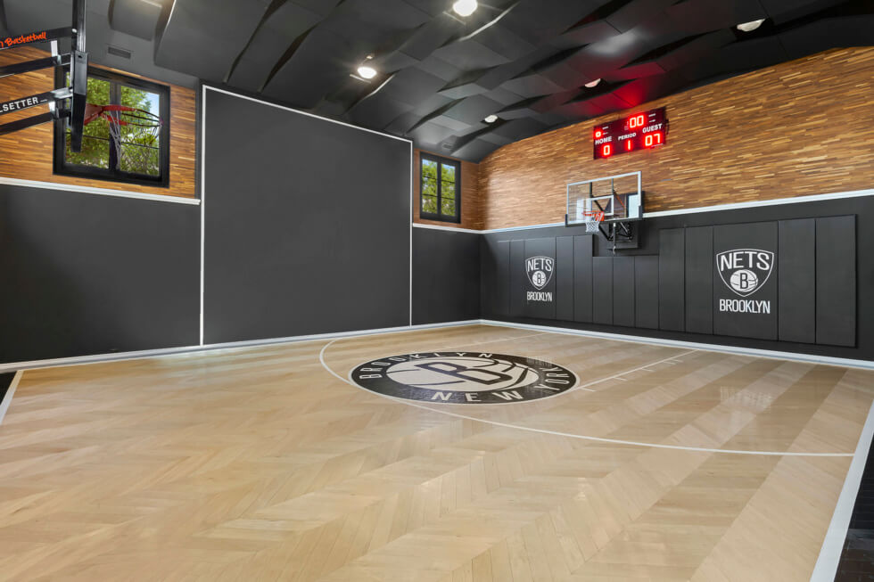 Meanwhile outside there’s a heated pool with a waterfall, another half-basketball court, a dining space with a grill and pizza oven, a 3-car garage, and a pool house cabana with a kitchenette and full bathroom.