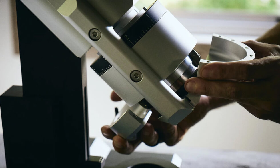 This machine looks more like a mini telescope than a grinder. Its knob to choose the size of the coffee grounds resembles that of the focusing dial found in telescopes. It also has a support base and a tubular body positioned as if poised for gazing at the sky.