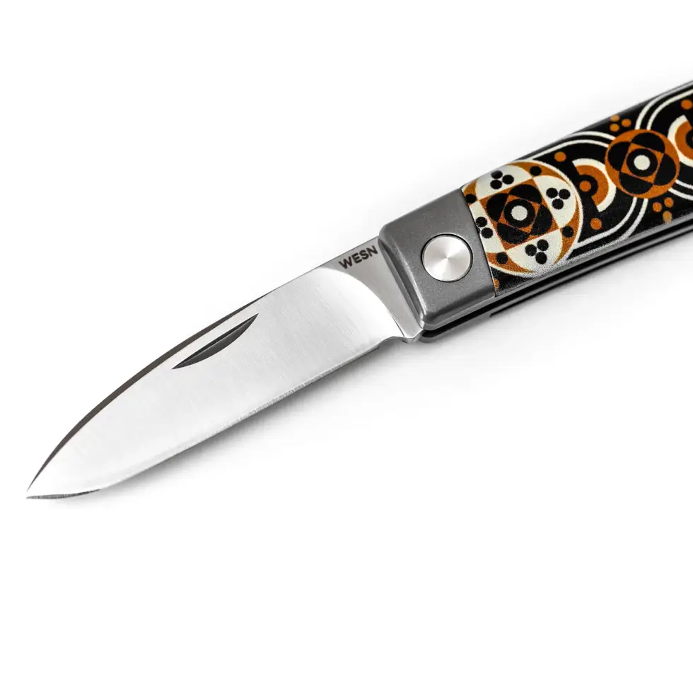 California-based artist Daren Thomas Magee staples this goal as a reality with his eye-catching artwork on the hilt. WESN gave him free rein to incorporate his earthy and minimalist art style on the G10 handle. The outcome is a visually appealing slip-joint knife with standout colors of brown, white, and black. The scales not only look but also feel great in the hands.