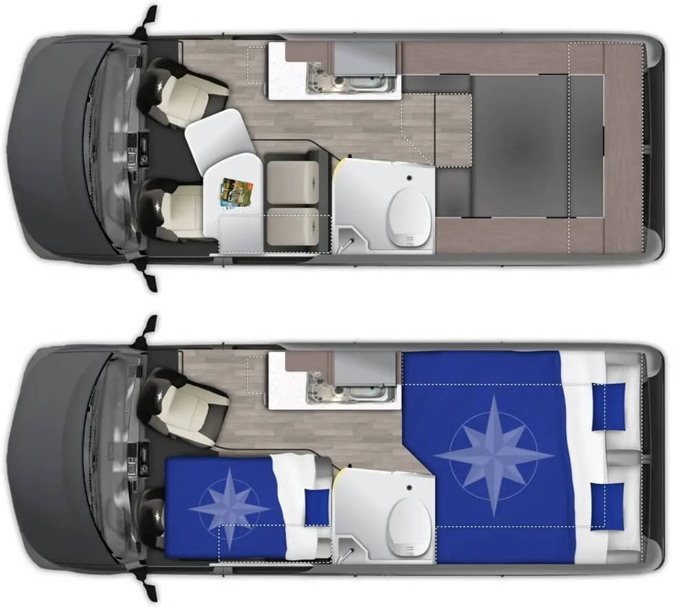 The drop-and-fold dinette bed accommodates two more, while the pop-up tent welcomes another two. Overall, the Wave is adequate for parties of six to seven people. Swivel cab seats and a two-seat bench face a dual-leaf extending table for meals.