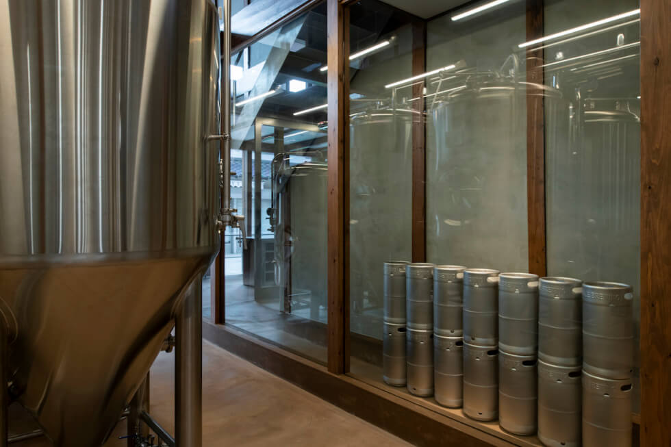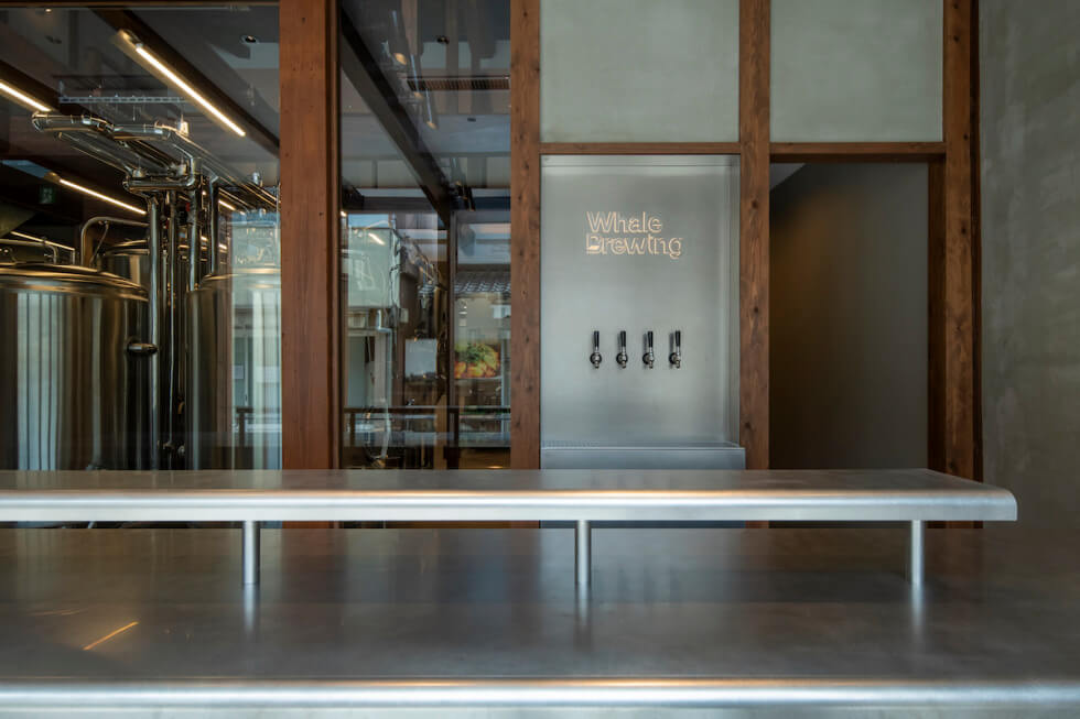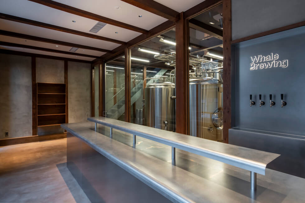 They retained this structure in the design and construction of Whale Brewing. The building then features a storefront area with a ceiling on the facade side and the brewing space uses the generous height of the second floor through an open atrium. Continuous glazing spans both levels and offers view of the street that highlights the robust beams and the brewery ambiance. From the outside, people can see the large brewing tanks inside.