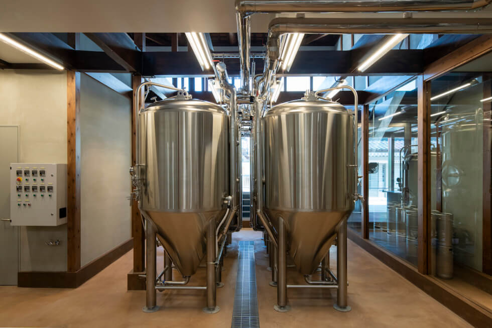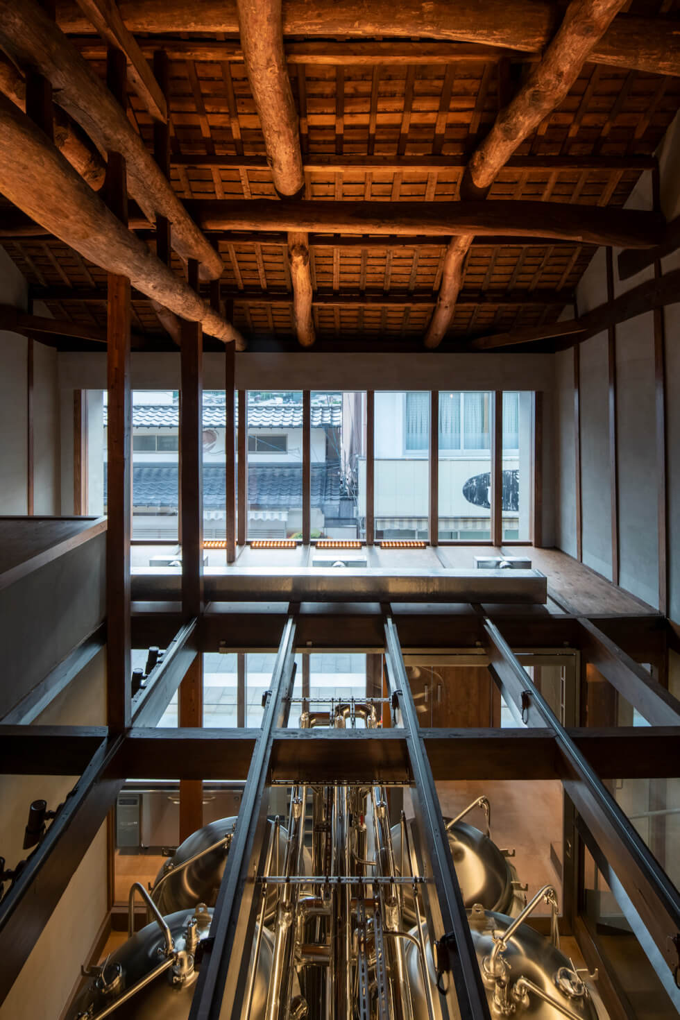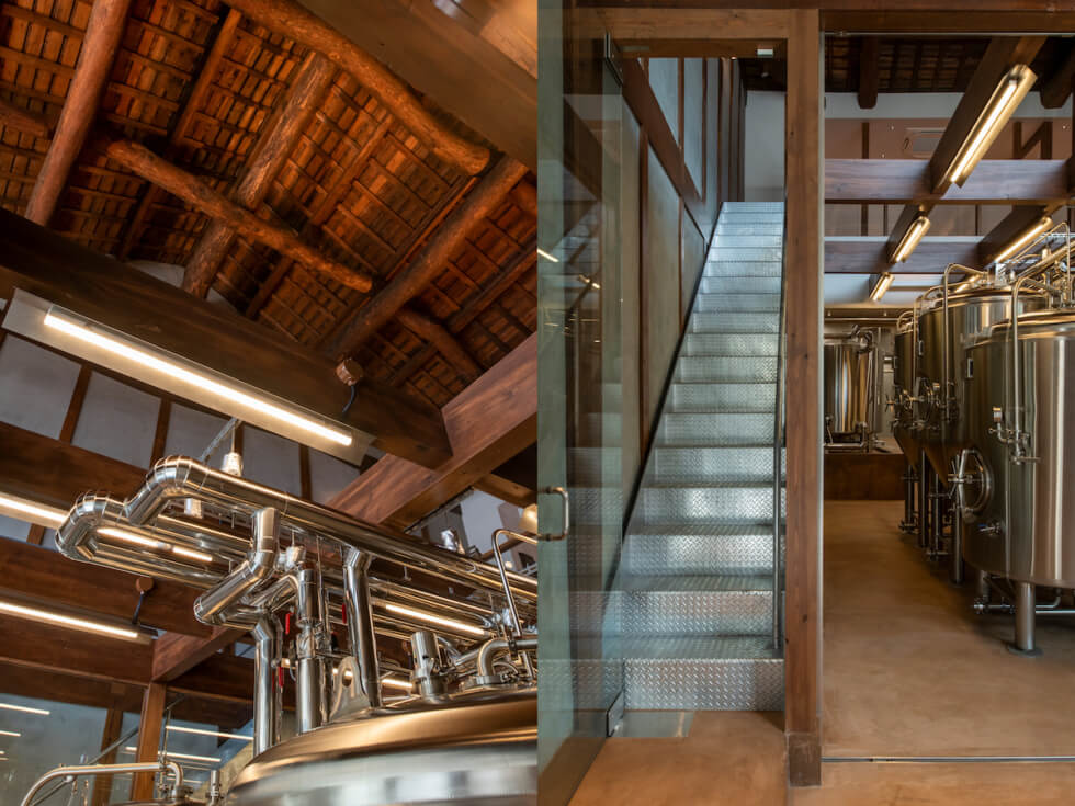 The team decided on a sloped design that connects the elevated rear of the building considering ground conditions. Meanwhile, stainless steel was used on the counter, handles, and staircase to align with the material theme used on the brewing tanks. Solid Japanese cypress were also utilized on selected façade pillars that feature rounded shapes for a sense of softness, while adding a distinctive design and accentuating the space’s height.