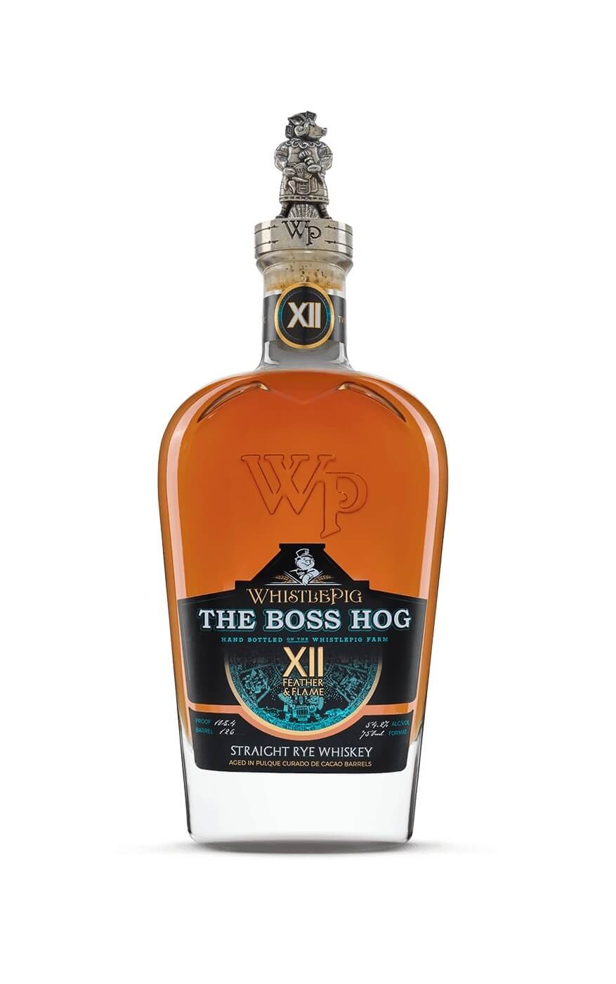 According to WhistlePig, The Boss Hog XII: Feather & Flame is “inspired by ancient rituals of Mesoamerica, Feather & Flame unites the wild fermentation of pulque with the rich, peppery chocolate of xocoatl.” At first, the liquid undergoes the standard aging process in new American oak barrels. Next, the straight rye whiskey goes into pulque curado de cacao casks to finish.