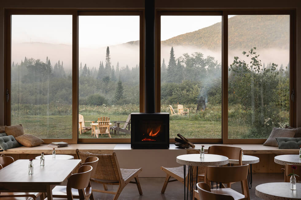 Meanwhile, the bar is on the riverside, south of the path. Here guests can sample farm-produced products and other local delicacies including cheeses, beers, and wines. The bar’s dining room juts out towards the river with large west-facing French windows offering captivating sunrise and sunset views of Mont-Tremblan. The bar interiors consist of a cathedral ceiling and a mezzanine floor which serve as a quaint space to sit and relax. Wild Tremblant offers sheltered camps covered with cedar shingles for guests to stay.
