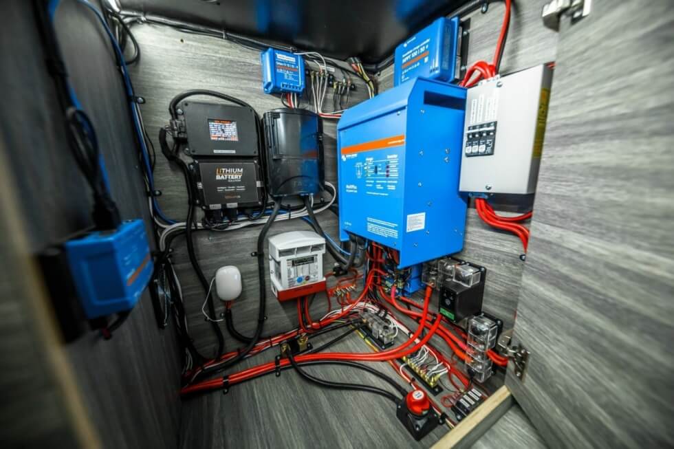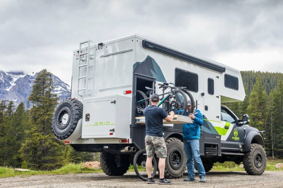 The GRID Series Campers runs on a 540Ah lithium battery bank with provision for 400W solar charging via a 3000W Victron inverter. Just like any home, it comes with a circuit breaker panel, LED lighting, USB and electrical outlets, and a 12V electrical system – Stage 4. A dedicated mobile app system lets you monitor the electrical systems. These campers are compatible with the Ford F-450/550 chassis cab trucks. They boast heavy-duty truck chassis, off-road suspension, and a strong aluminum body.