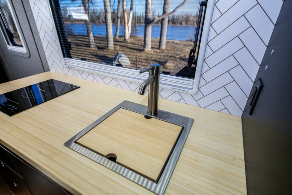 If you want freshly-cooked meals then they come with a fully-equipped kitchen. There’s a sink with an electric water pump, a convection cooktop, a fridge and freezer, and a 3-gallon hot water heater. It also has 68L of freshwater storage and an enclosed and heated grey water tank compartment.