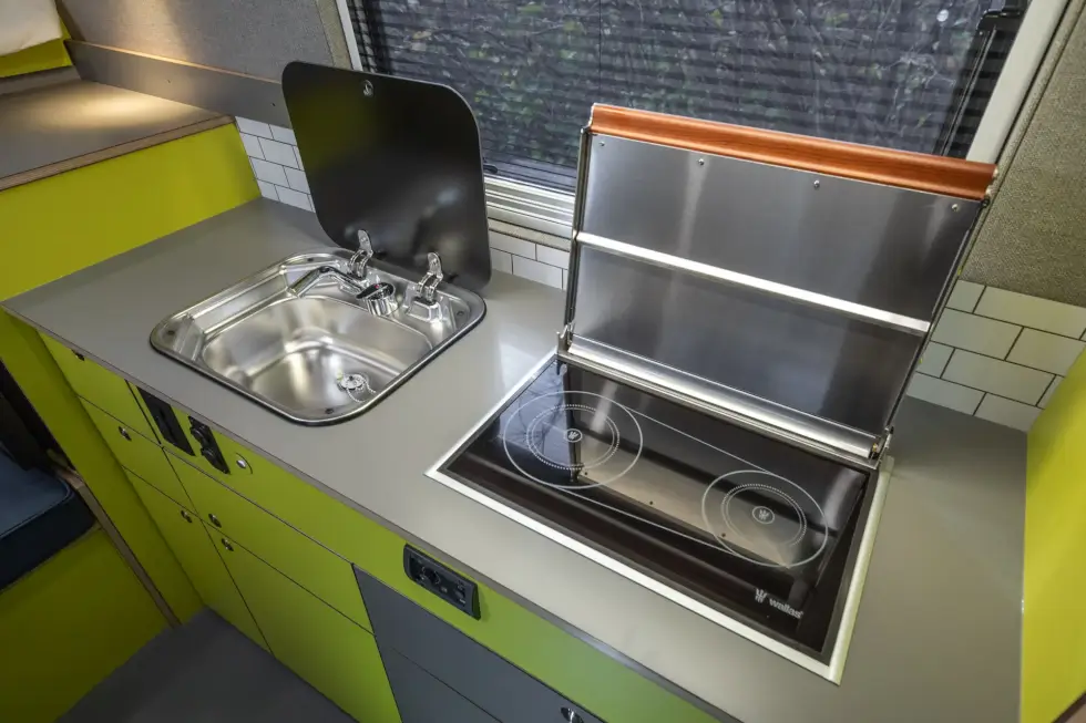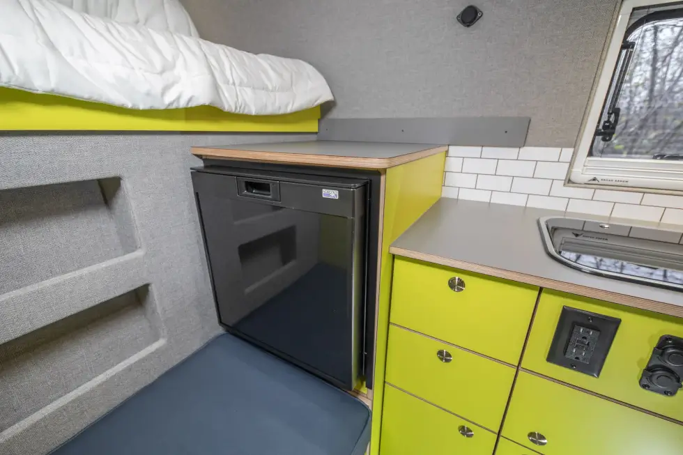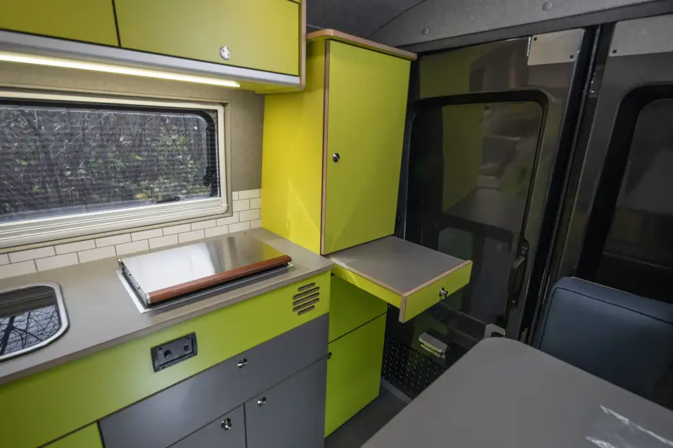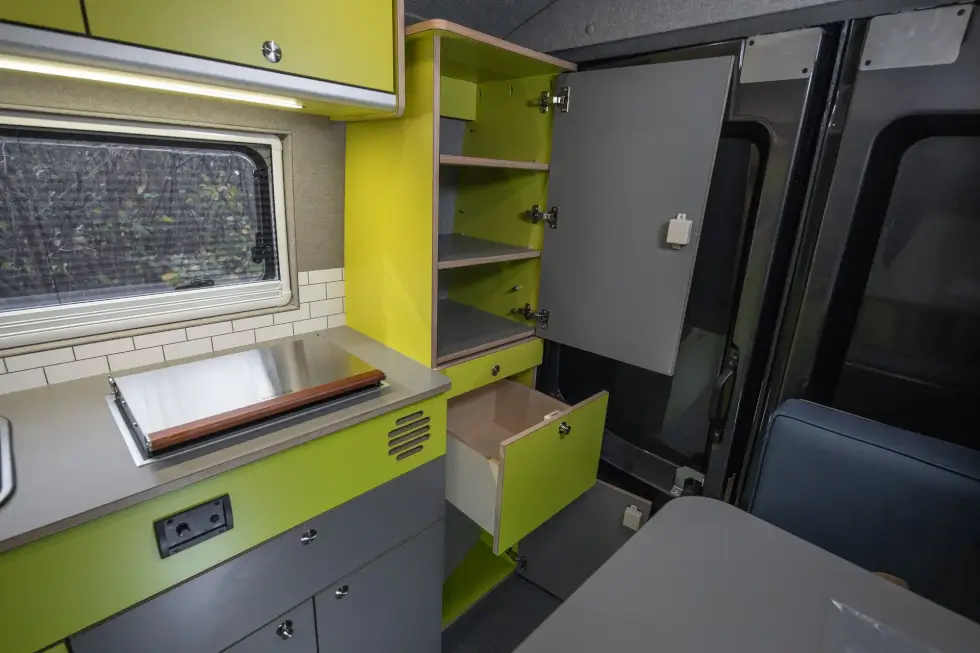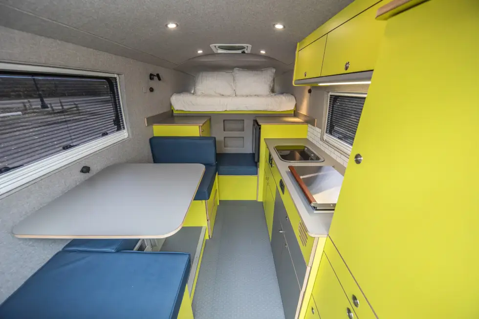 According to Wilderness Vans, there’s a galley with a sink and stove, a 2.7 cu/ft fridge, a Maxxair fan, a Wallas cooktop/heater, a toilet cabinet, rear storage cabinets, and a 19-liter fresh/19-liter grey water tank. Configure your Range camper’s off-grid capabilities with solar panels up to 350W, USB/120V outlets, a battery bank/circuit breaker panel, a battery monitor, and more.