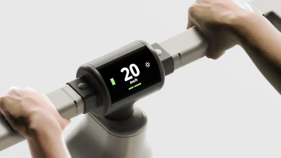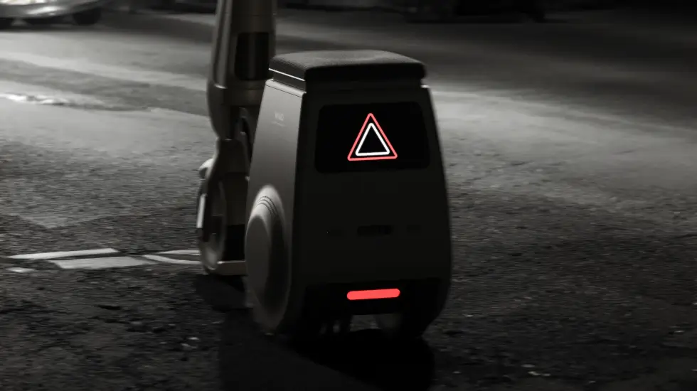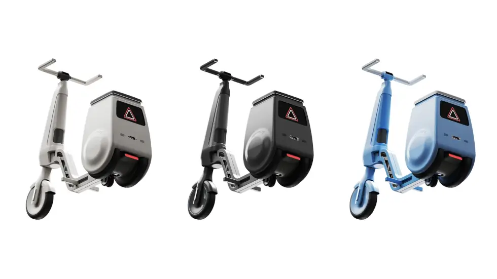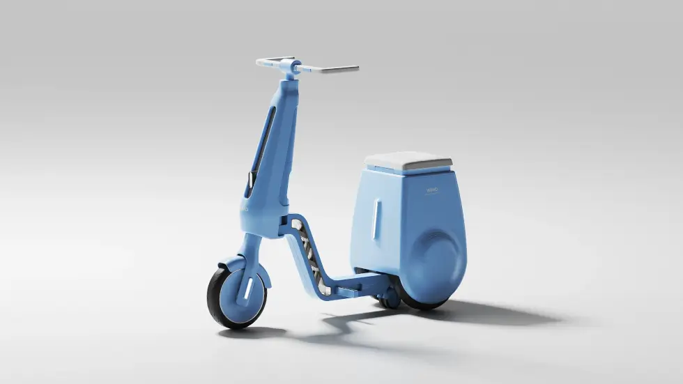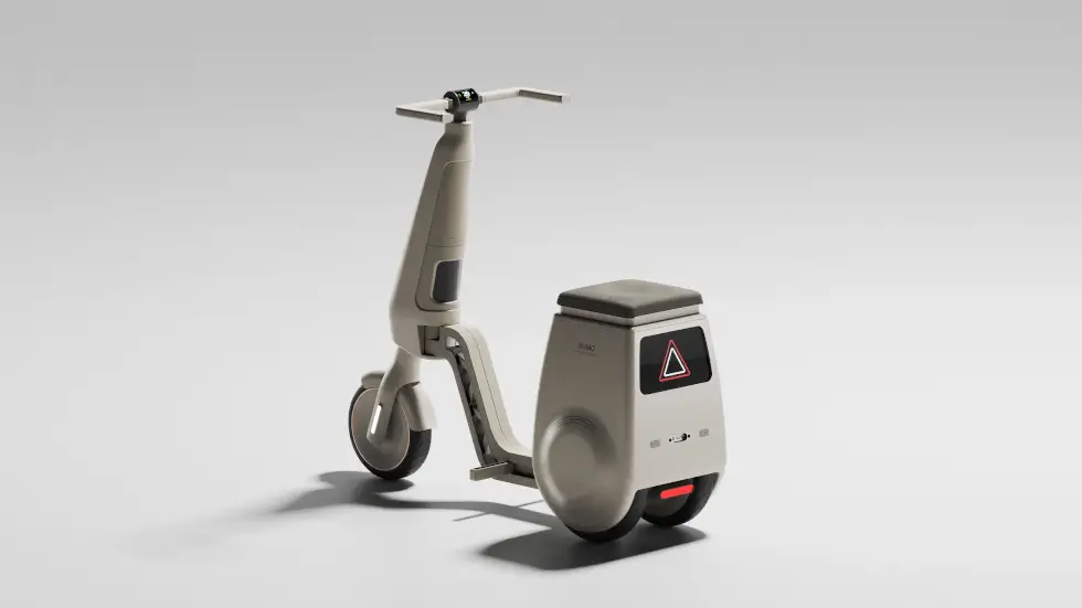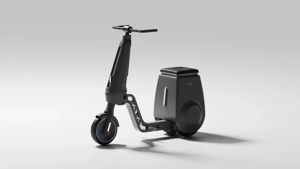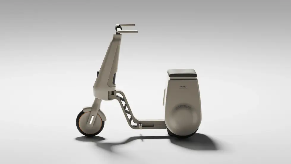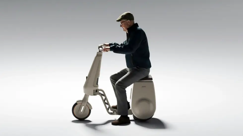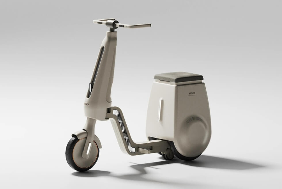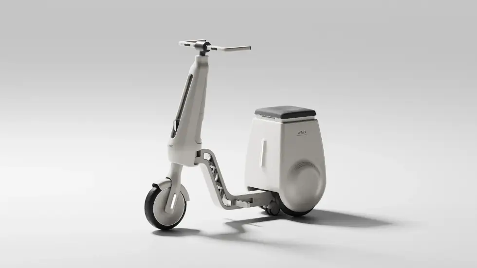 What comes to mind is the Gita series by Piaggio, which self-balances and follows you around on two wheels. A handy compartment is accessible under the seat. As for the main body, the footpegs fold into the frame as it splits down the middle. With three wheels on the ground and a handle, the WIMO bolsters the user’s stability.