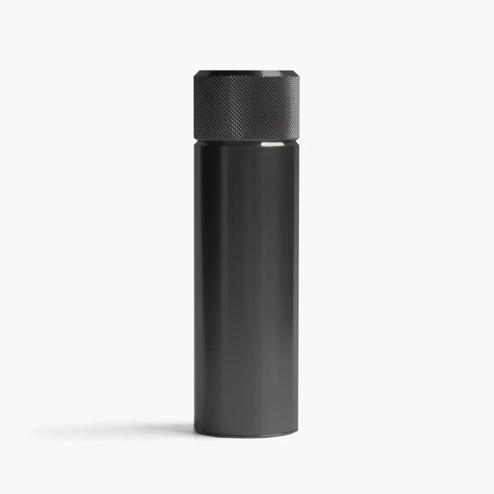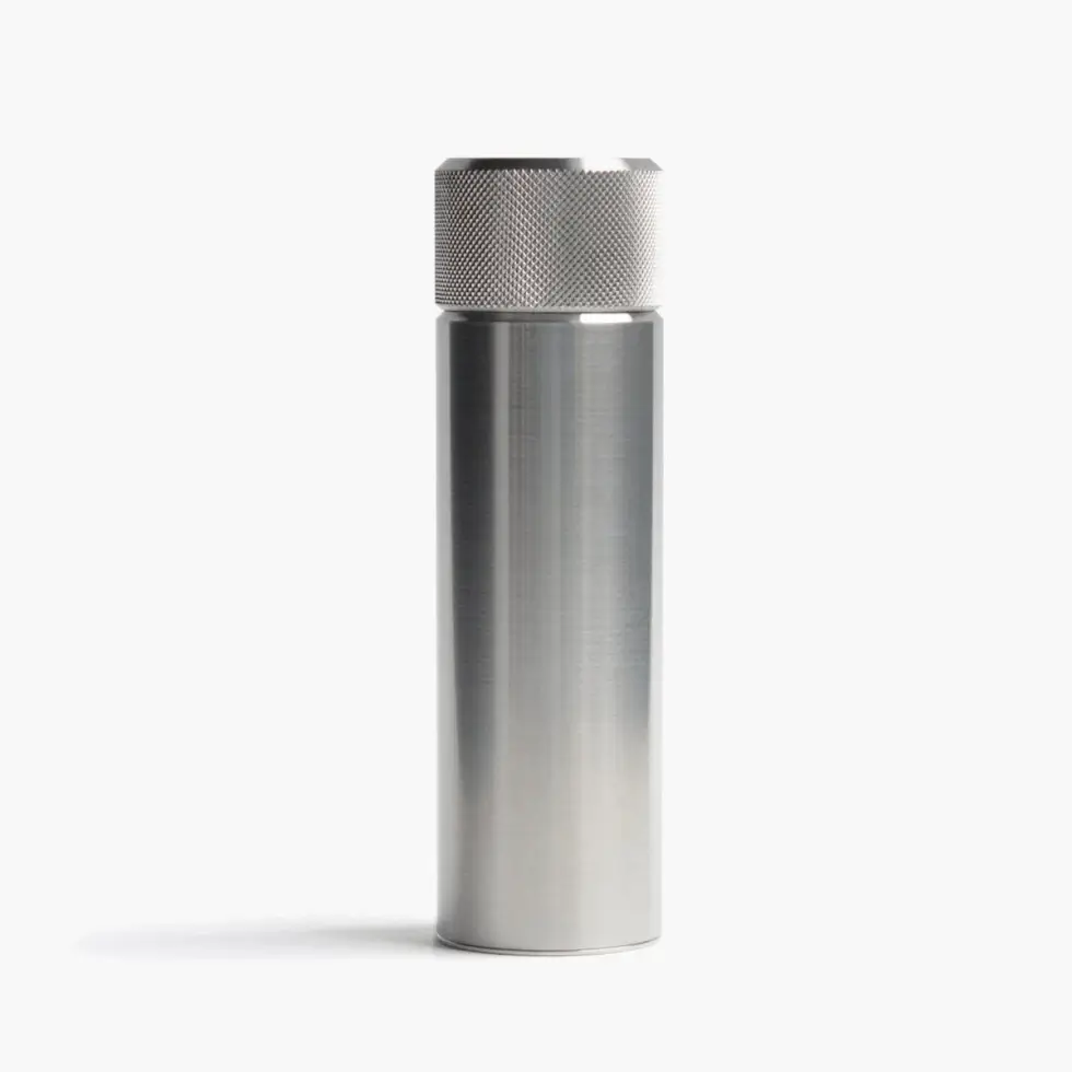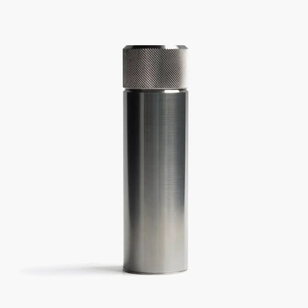The Wingback Hip Flask comes in either stainless steel, titanium, or black steel. The steel is CNC-machined from aerospace-grade 316 stainless steel, which is food and dishwasher safe, doesn’t alter the flavor of its contents, and is virtually indestructible. The Black Steel is corrosion and scratch resistant and the Titanium develops a protective oxide layer and no longer requires additional care. All while being carry-on friendly with its compact size and weight, at 1.47” D x 5.00” L and 6.35 oz, respectively.