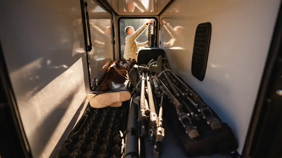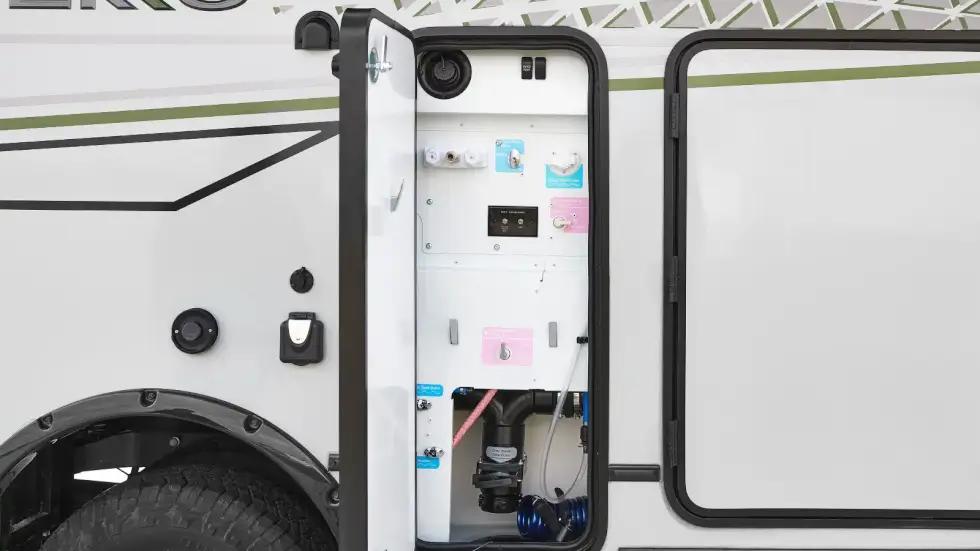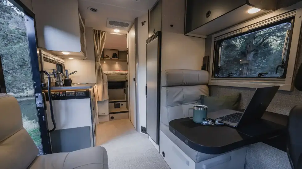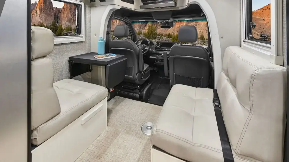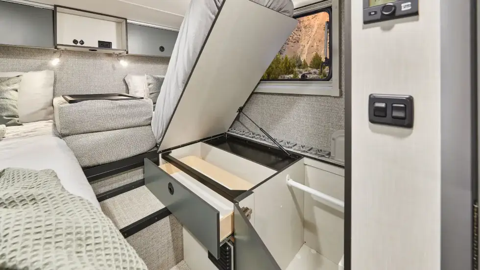 It rides on stylized performance wheels shod in all-terrain tires. As for the details that truly matter to buyers, we have the 23B floor plan to comfortably sleep up to five people. The modern interior’s decor can be decked out in Veredis or Juniper motifs. The layout shows two twin beds positioned at the rear and an optional pop-top roof.