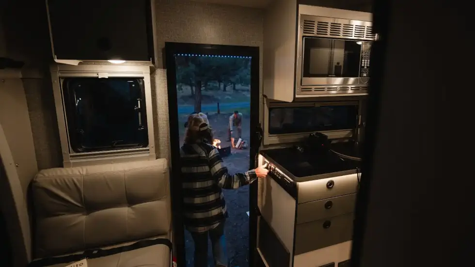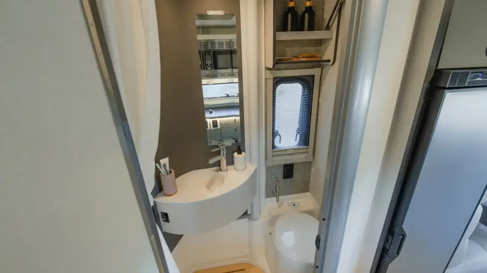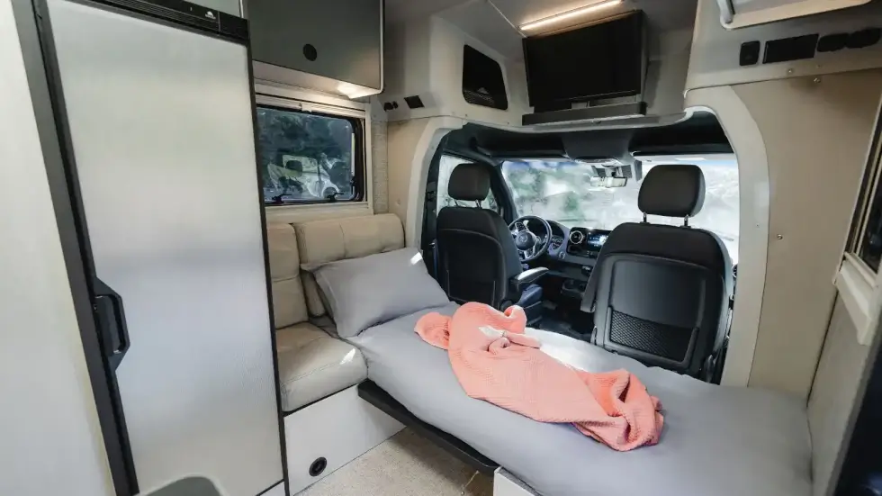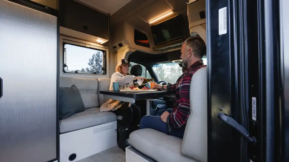 Prepare meals with ease as the galley features laminate coutertops, a portable single-burner induction range top, microwave/convection oven, a single-door fridge, sink with faucet, and plenty of storage for your supplies. The EKKO Sprinter includes a 13,500 BTU air conditioner and Truma VarioHeat system for climate control.