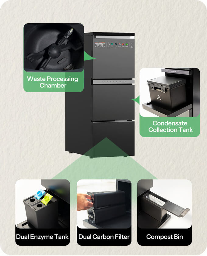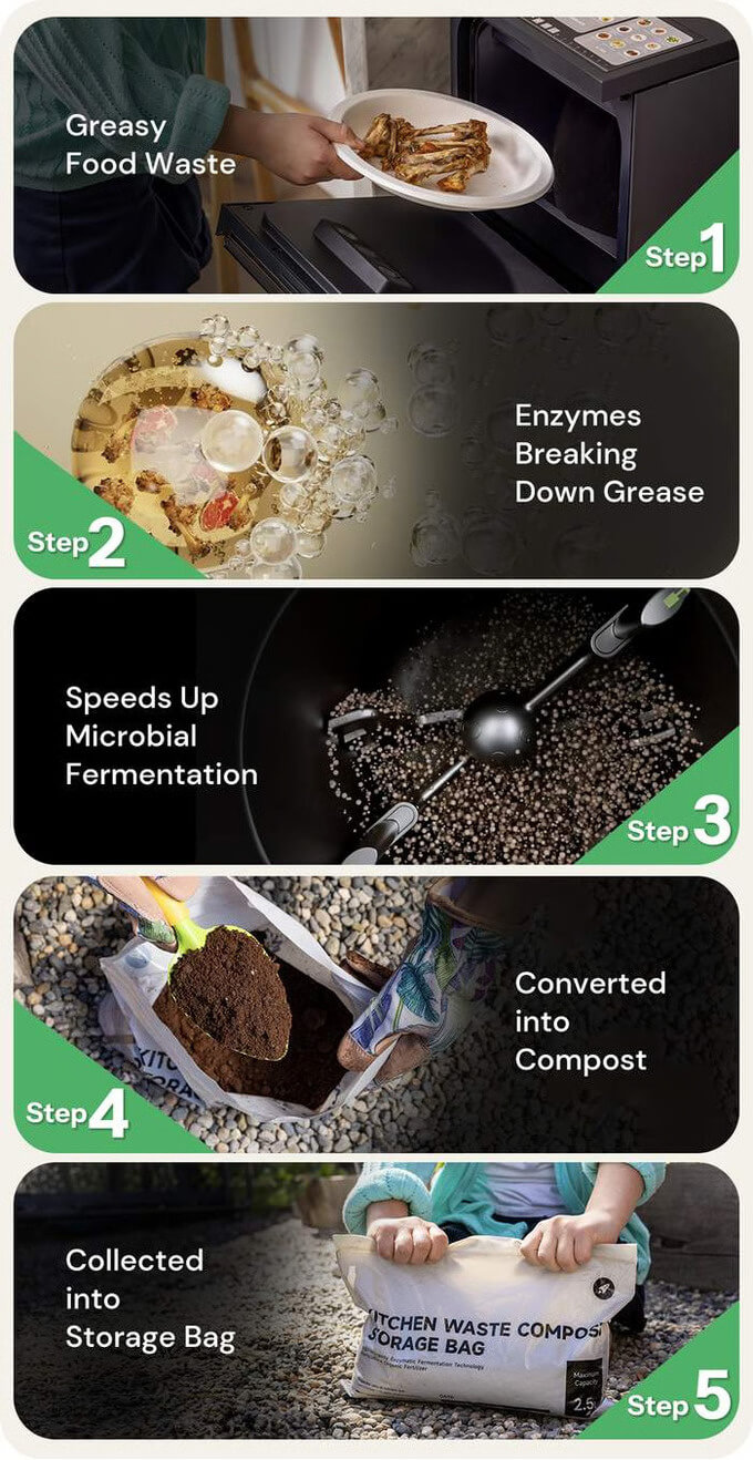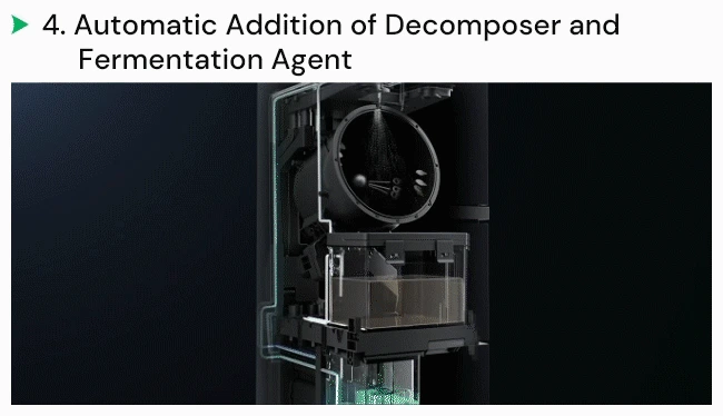 Meanwhile, the fermentation agent accelerates the microbial fermentation process. This machine uses an enzyme blend that is safe, effective, and meets EPA environmental standards and USDA organic compost guidelines. This includes natural components like amylase, ligninase, and lipase, along with nano-penetration agents, deionized water, and a touch of fragrance.