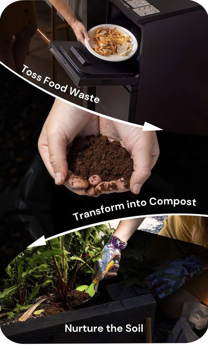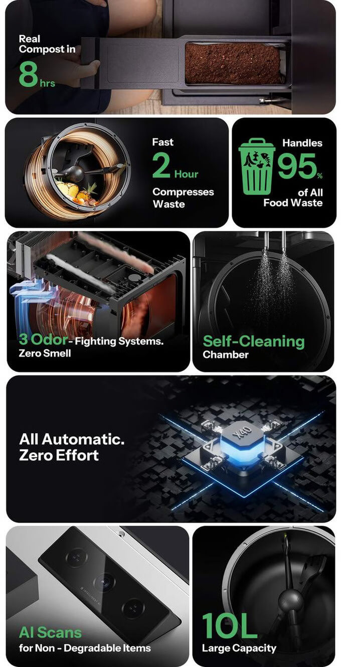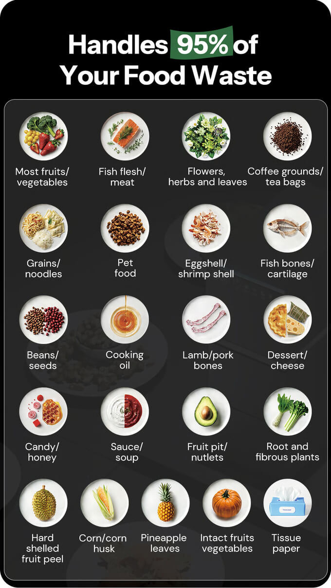 It decomposes fruits, vegetables, plants, meat, coffee grounds, pet food, fish bones, eggshells, and even compostable napkins and takeout containers. Built-in AI detection ensures cans, glass, or other foreign objects do not go in the mix.